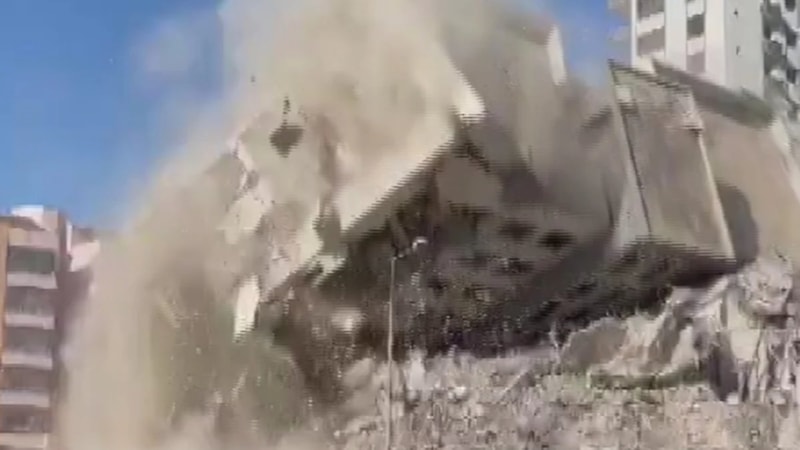 Depremlerin vurduğu İskenderun ilçesinde çökme riskine karşı çevresindeki binalar boşaltılan 15 katlı yapı kontrollü olarak yıkıldı. O anlarsa kameraya yansıdı.