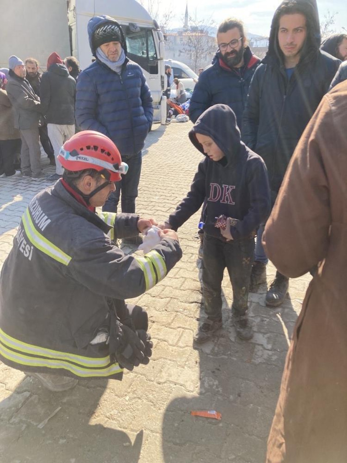 Hatay’da bir binanın enkazında kurtarma çalışmasına katılan Erzurum İtfaiye Daire Başkanlığı Arama Kurtarma Ekibi’nde görevli bir personel, çalışmaya ara verdiği sırada alanda üşümüş bir çocuğu fark edince, yardım malzemelerinin olduğu yerden bir çift eldiven ve bir mont getirdi.