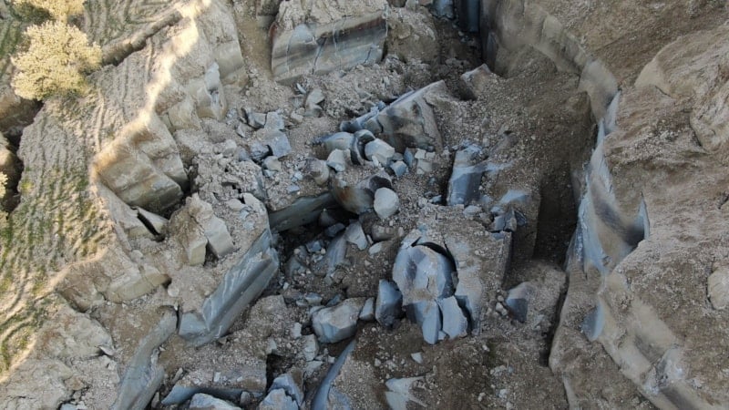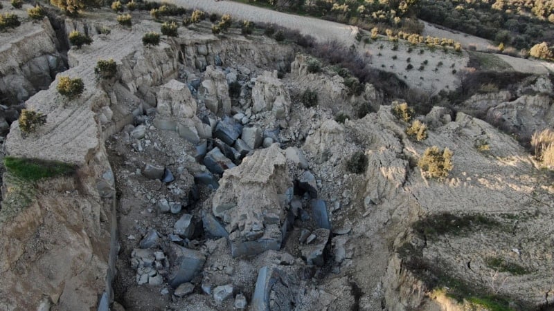 Olayı anlatan bölge sakinlerinden Aziz Gündüz, “Çok büyük bir patlama oldu, ben görmedim ama ses duydum. Sabah bu tarafa doğru baktığımda maalesef bu tarafta böyle bir yıkıntı gördük. Bu taraf tarlaydı, dümdüzdü. Şimdi kepçe dahi inmez. Bilemiyorum ne olduğunu.” dedi.
