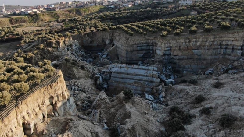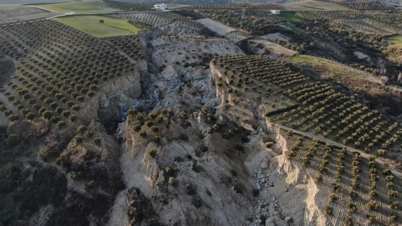 Kahramanmaraş merkezli depremler sonrasında Hatay Altınözü ilçesine bağlı Tepehan Köyünde 35 dönümlük zeytin bahçesini ortadan ikiye bölen yarık oluştu.