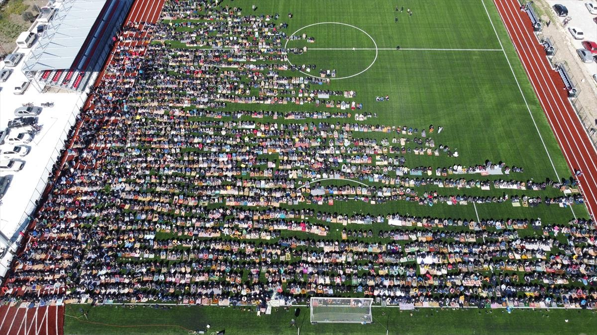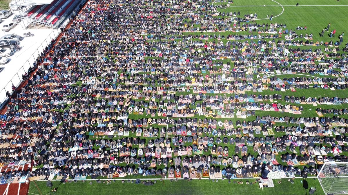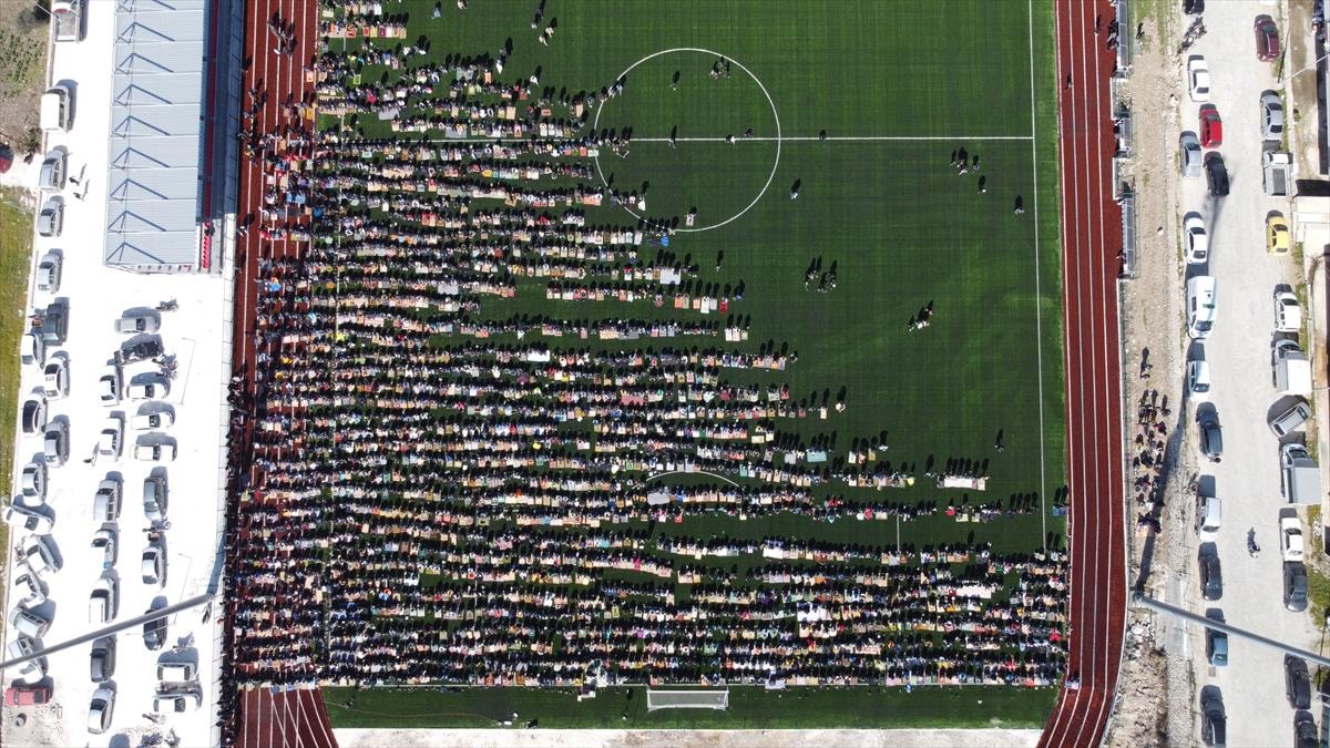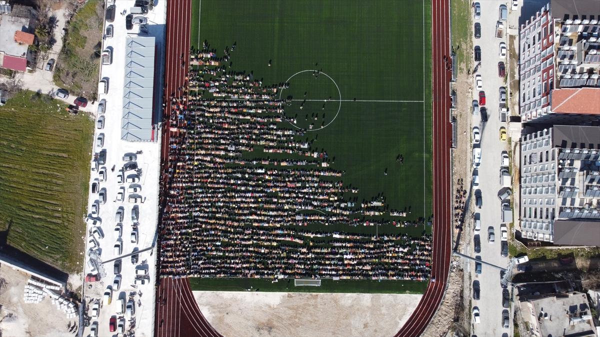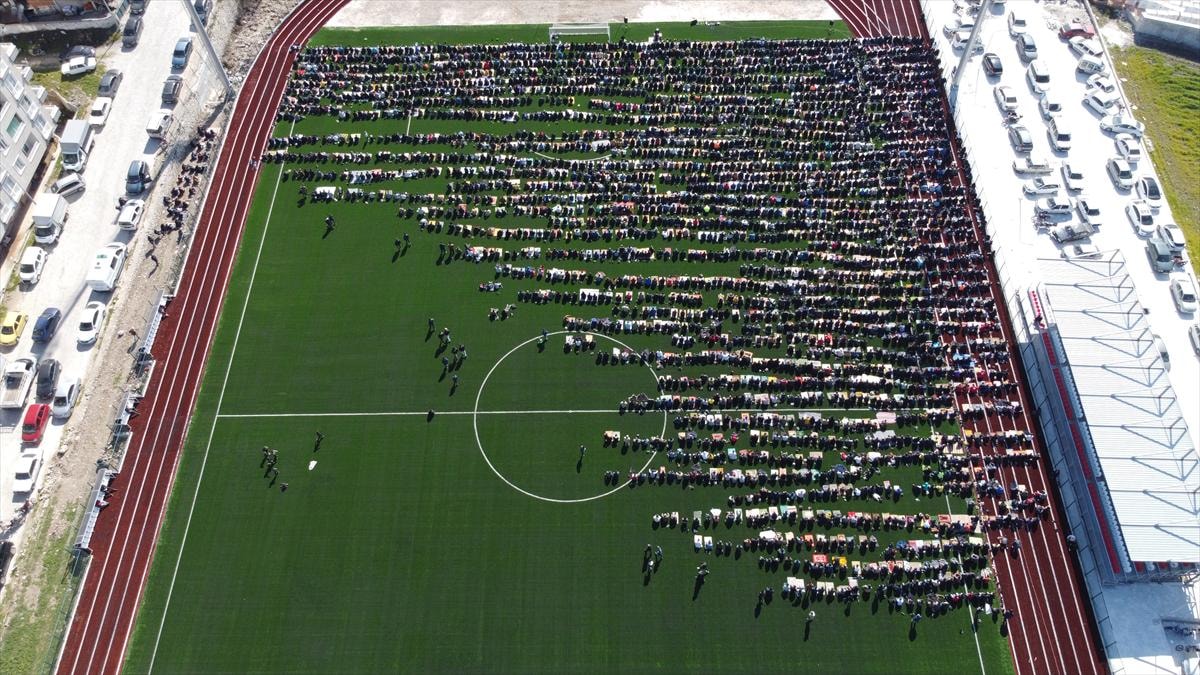 Vatandaşlar, futbol sahasında saf tutarak namazı eda etti. Ardından sarsıntılarda hayatını kaybedenler için gıyabi cenaze namazı kılındı.