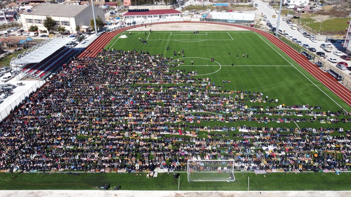 Depremlerin ağır hasarı beraberinde getirdiği kentte cuma namazı, Yayladağı ilçesindeki stadyumda kılındı.