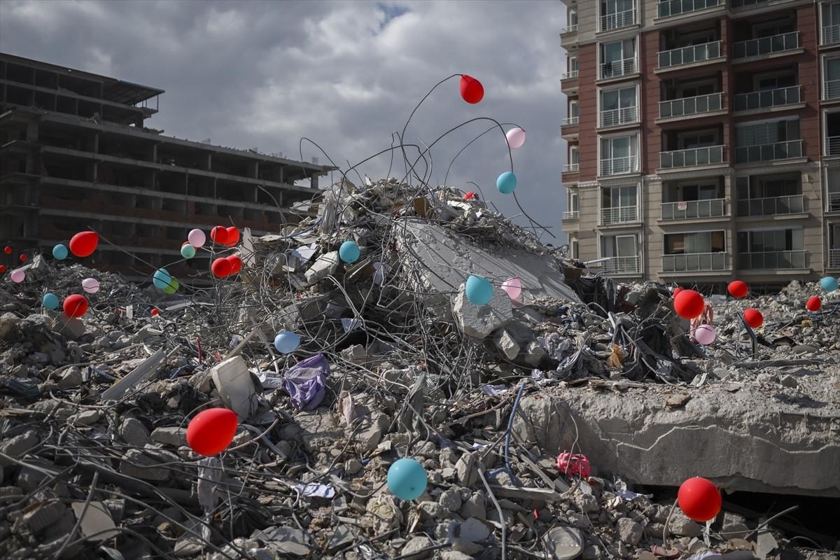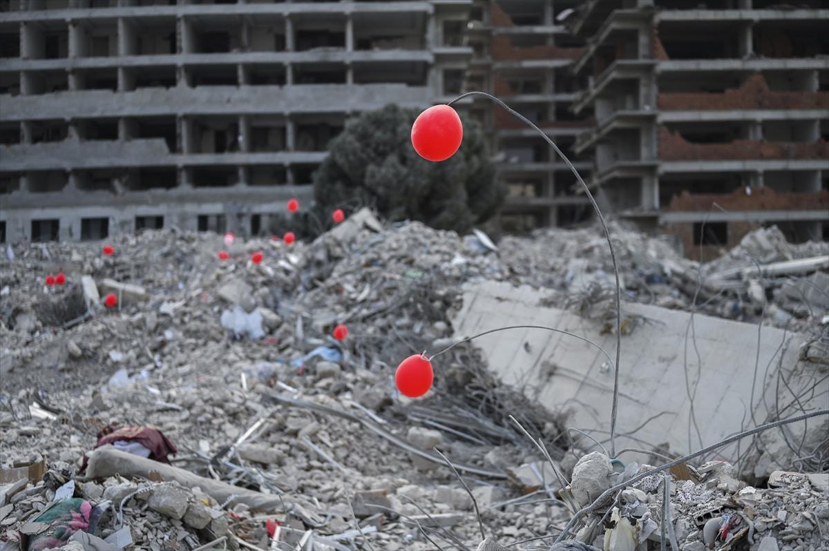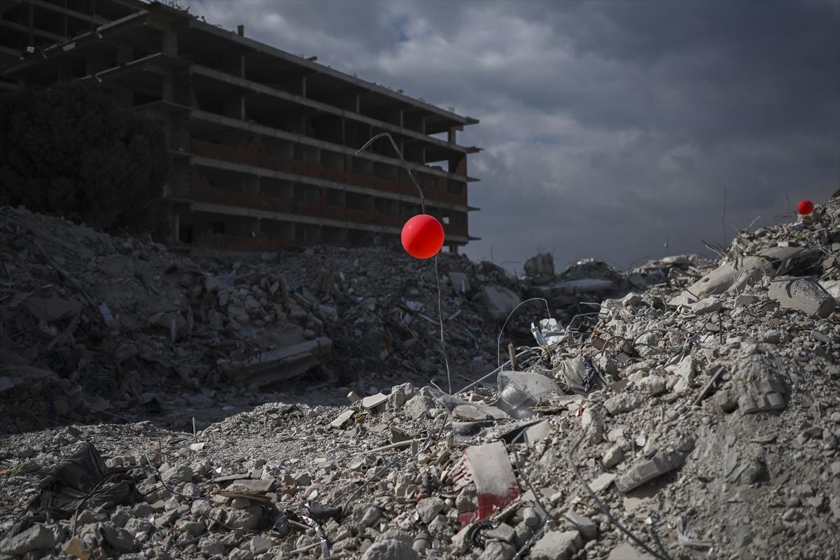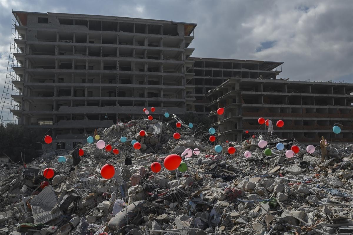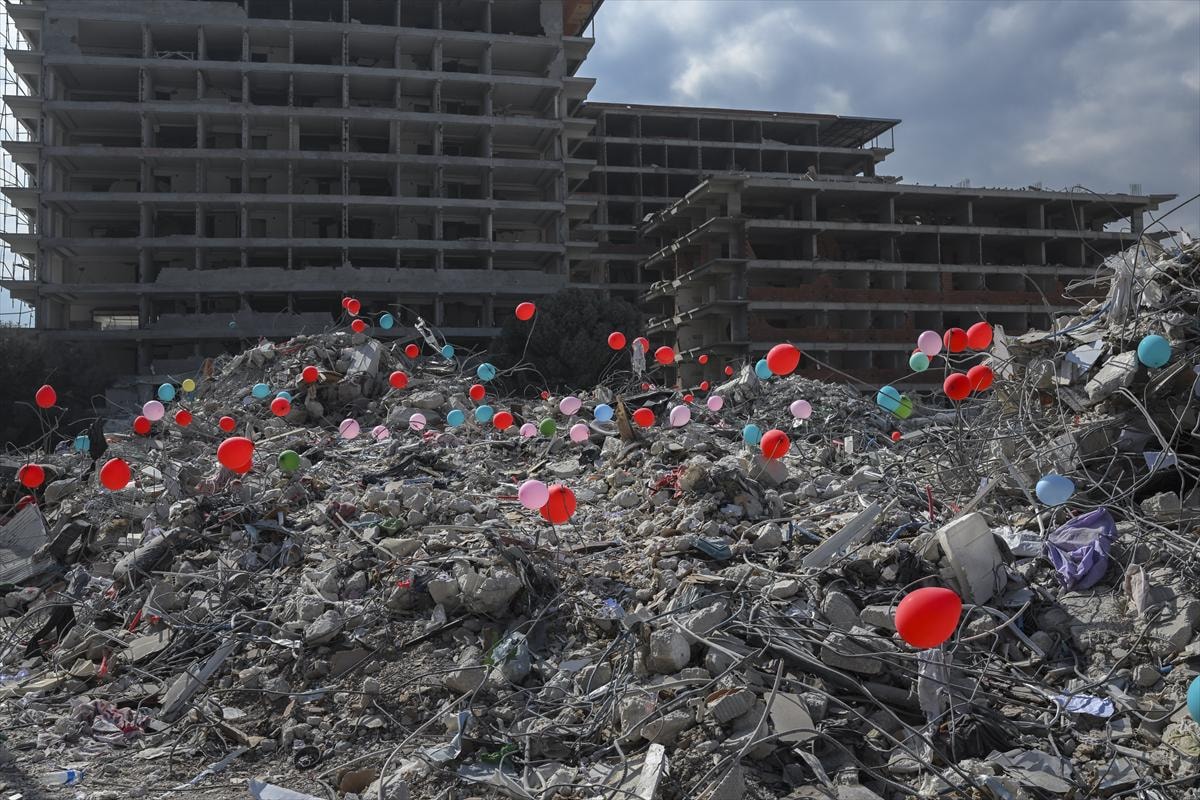 Okulun enkazındaki demir çubuklara, Adana'da faaliyet gösteren Ogün Abi Çocuk Derneği'nin üyelerince farklı renklerde balonlar asıldı.