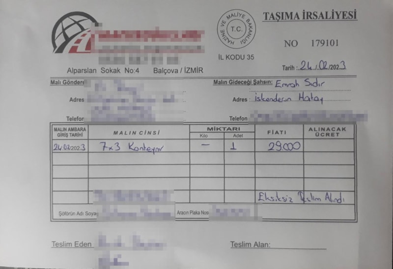 Karakola giderek ifademi verdim. Delileri ve elimdeki dokümanları teslim ettim. Cumartesi günü iletişimin kesilmesinin ardından bana attıkları video ve irsaliye faturasını sildiler. Fiyatı uygun geldiği için şüphelenmiştim. Diğer firmaların verdiği fiyata göre uygun gelmişti. Bunu sorduğumda ‘Devlet bizlere deprem bölgesine giden konteynerler için teşvik veriyor. Depremzedelere gönderilen her konteyner için teşvik alıyoruz. Diğer firmalar bunu ceplerine atıyor’ dediler.