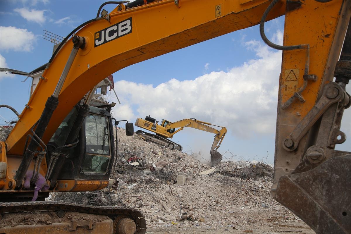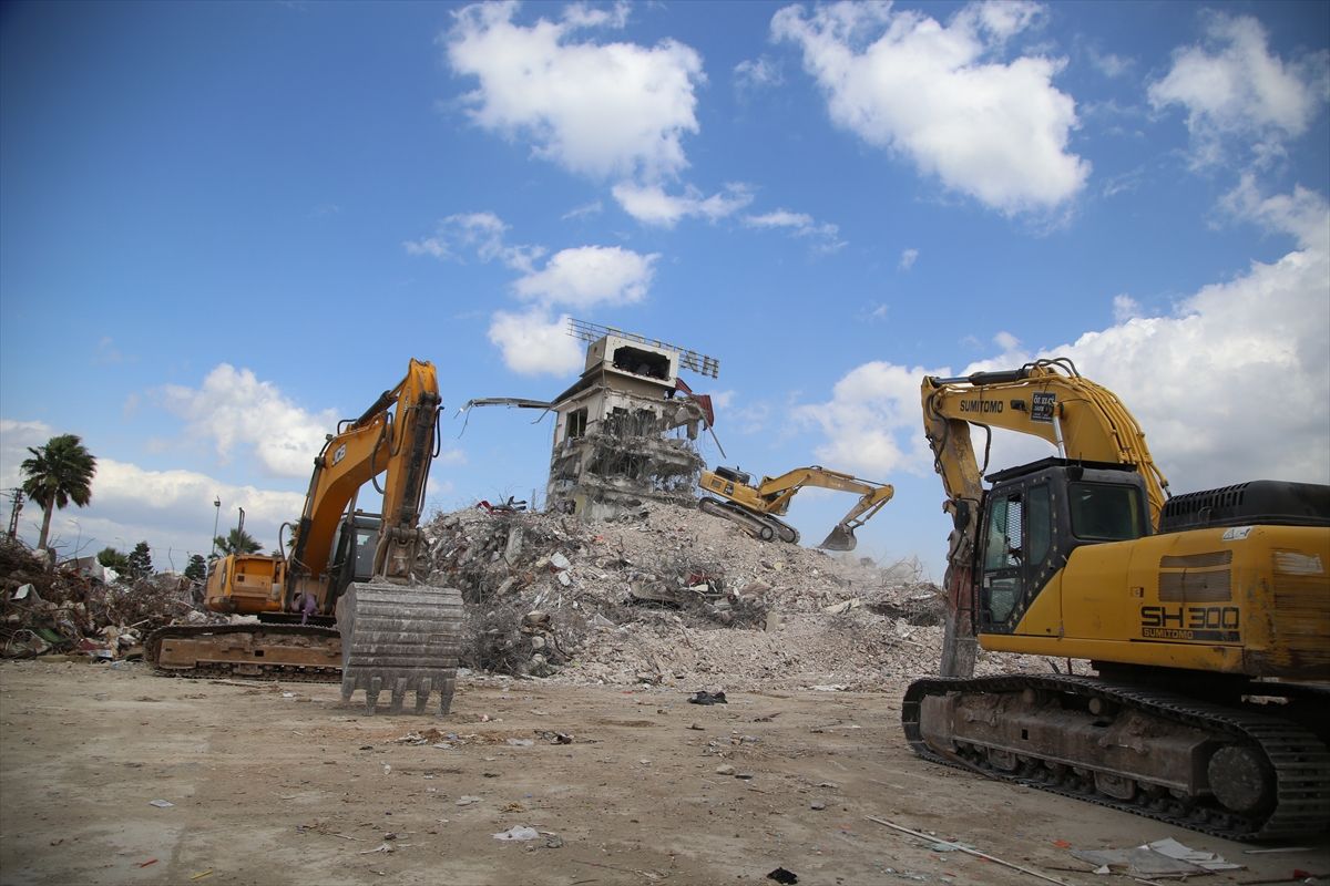 Antakya ve Defne ilçelerinde depremlerde yıkılan ya da yıkım kararı verilen binalarda enkaz kaldırma çalışmaları ekiplerce yürütülüyor.
