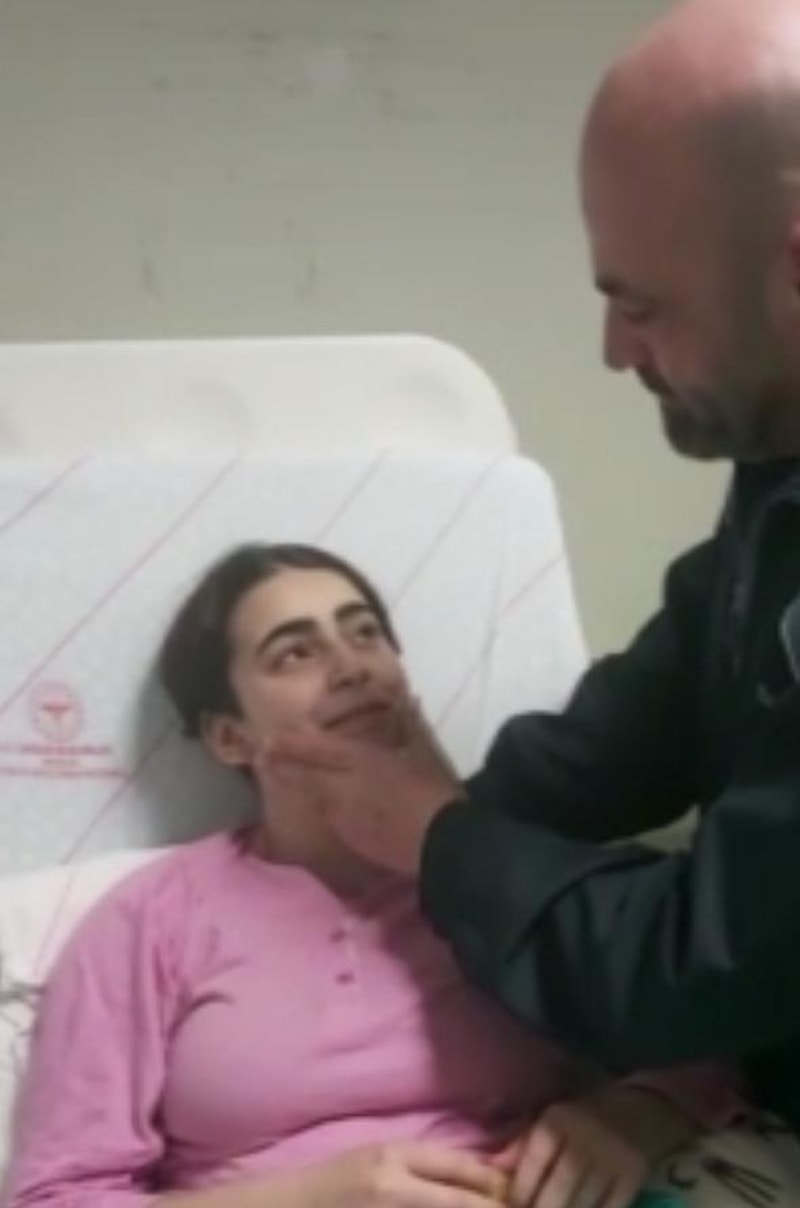 Hatay'ın Antakya ilçesinde yıkılan apartmanın enkazından kurtarılan baba ve 14 yaşındaki kızı, ilk kez hastanede bir araya geldi. Duygusal anların yaşandığı buluşma, cep telefonu kamerasına yansıdı.