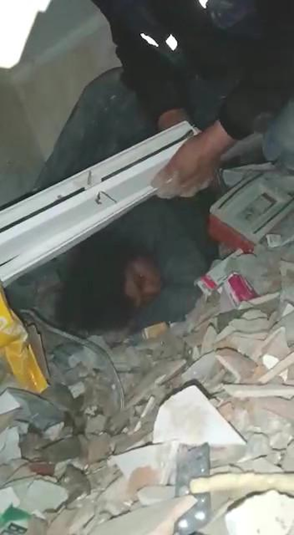 Görevlilerden biri, "Besmele çek gel teyzem." diyerek depremzedeyi yönlendirdi. Can acısıyla hareket etmeye çalışan kadın, dualar ederek ilerlemeye başladı.