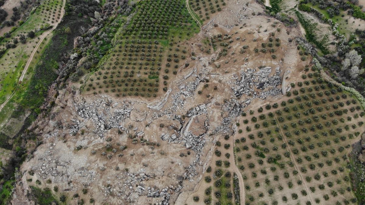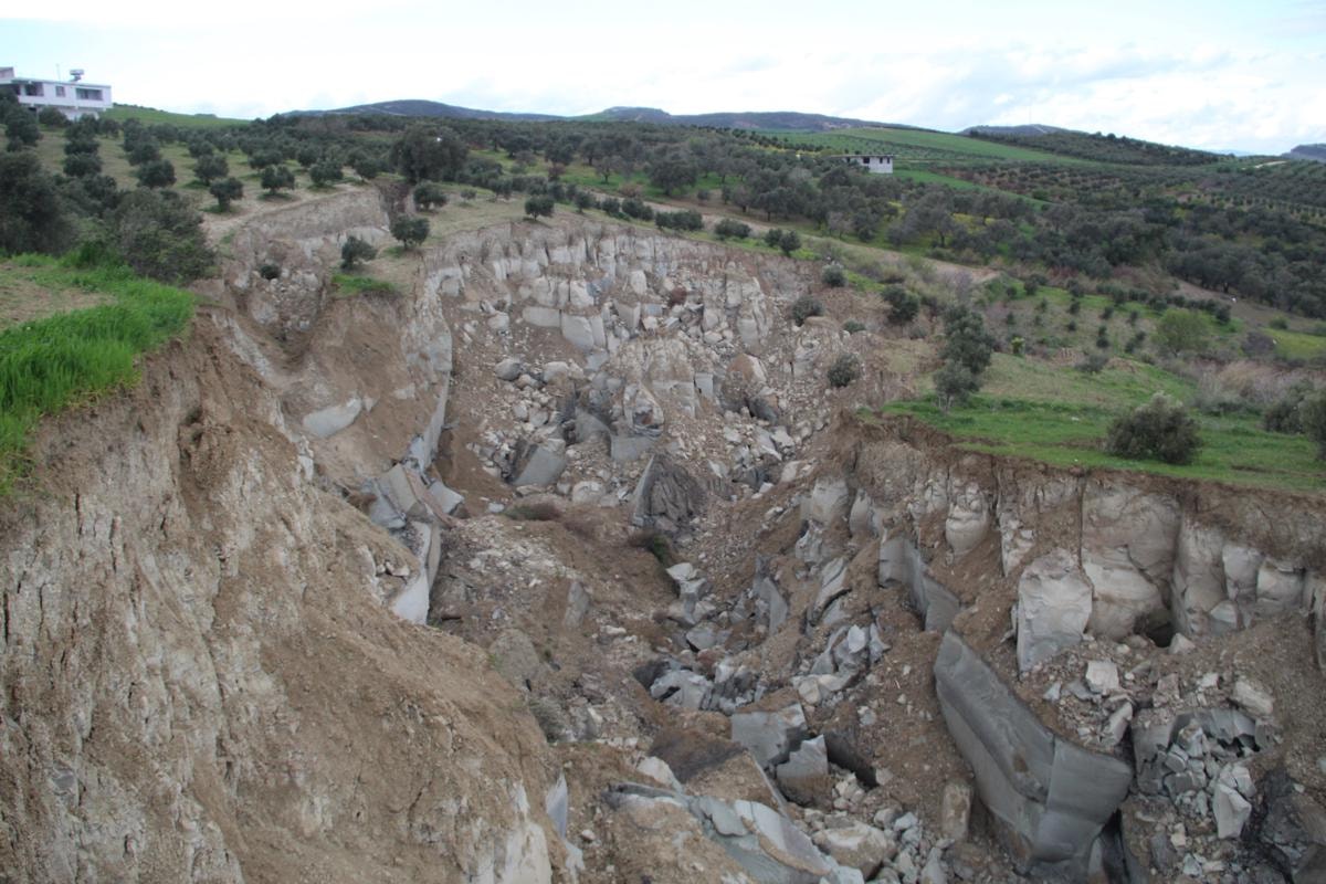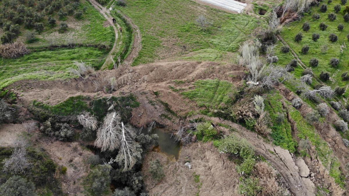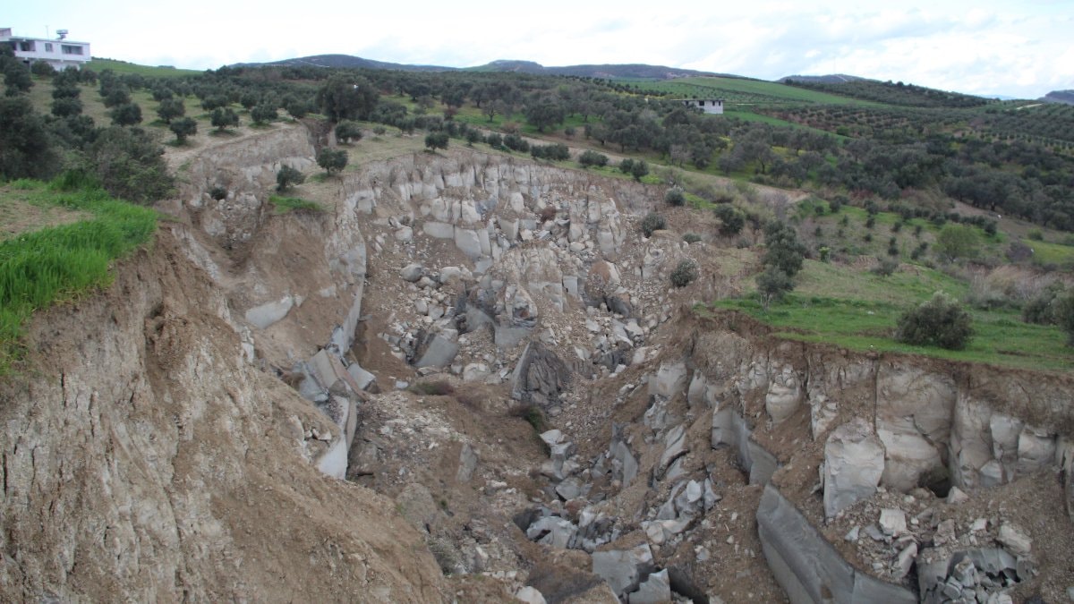 Yaklaşık 200 metre genişliği, 400 metre uzunluğu ve 50 metre derinliği bulunan yarığın, zeytin bahçesini ikiye böldüğü ve hattın vadi içine doğru gittiği görüldü.