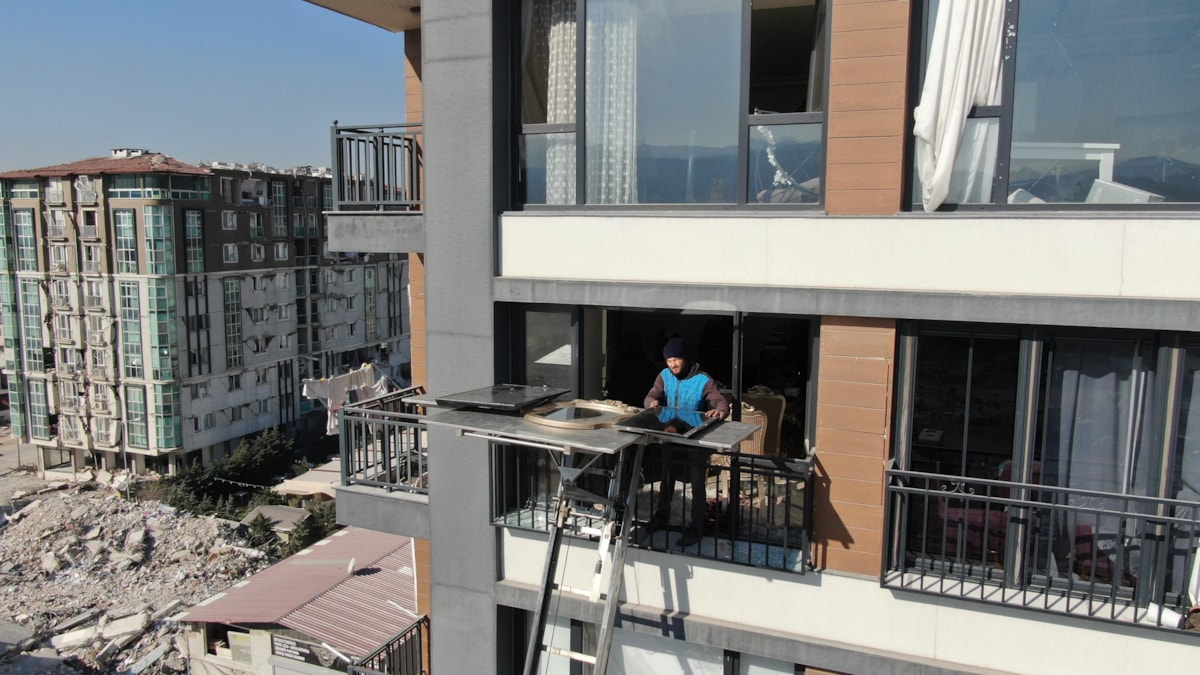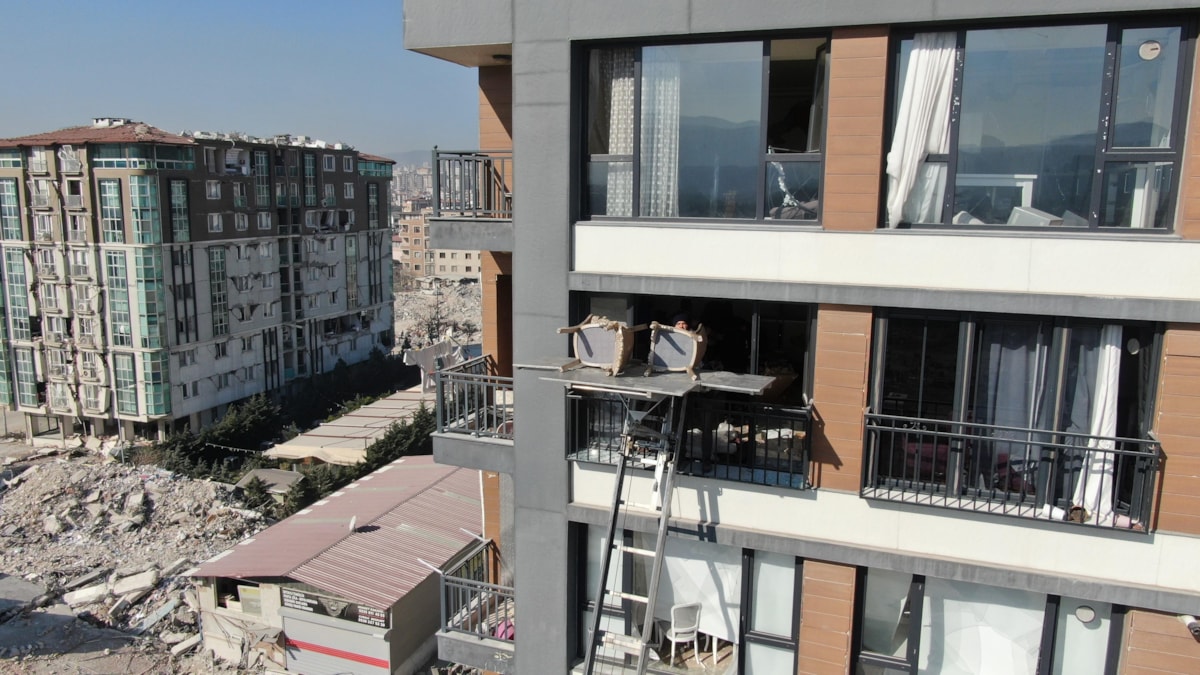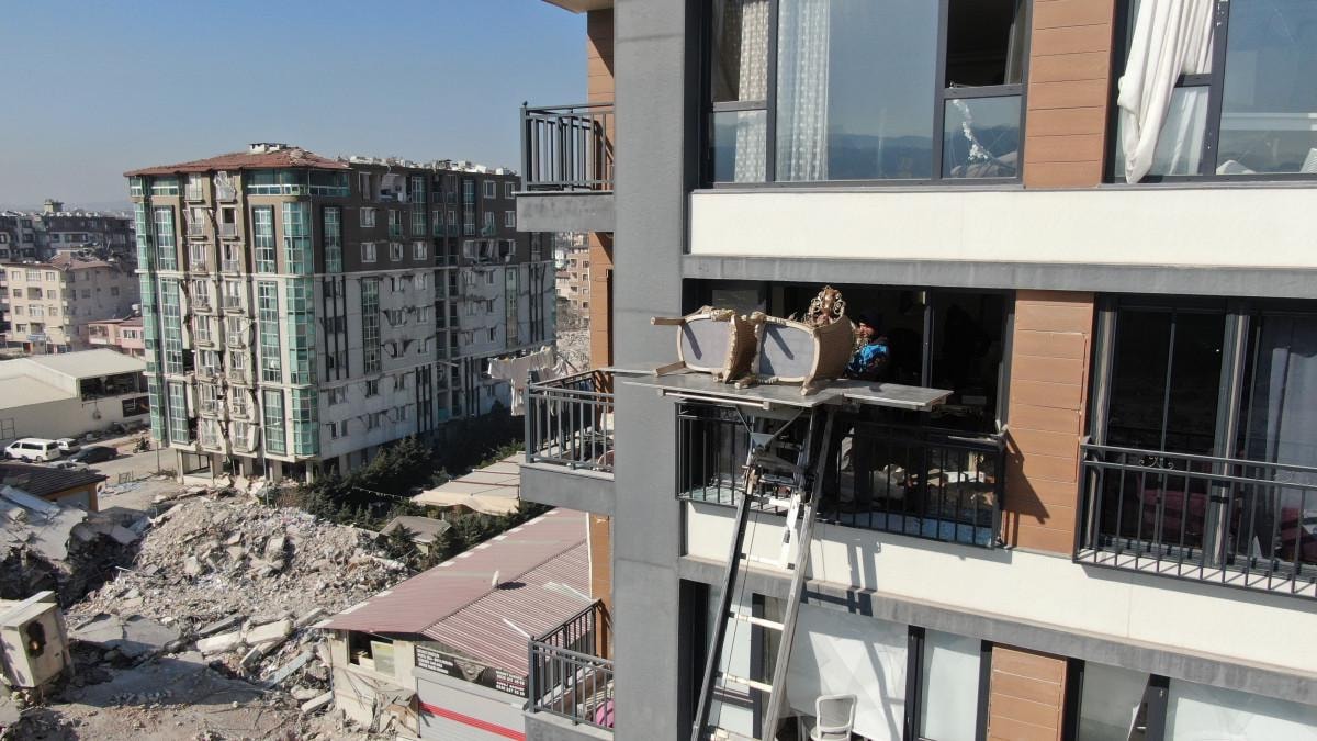 Hatay'da depremden hasar gören binalardaki eşyalar vinç desteğiyle taşınıyor.