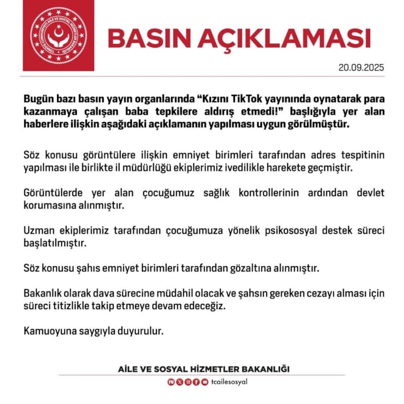 Aile ve Sosyal Hizmetler Bakanlığı, Hatay'ın Erzin ilçesinde, TikTok'tan canlı yayın açarak kızını oynatan babanın gözaltına alındıktan sonra tutuklandığı, çocuğun ise devlet korumasına alındığını bildirdi.