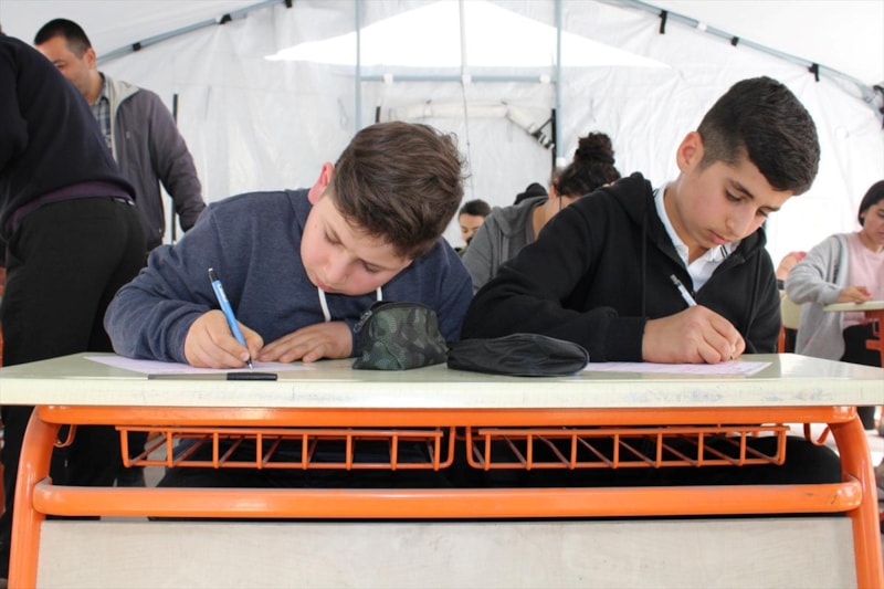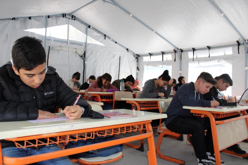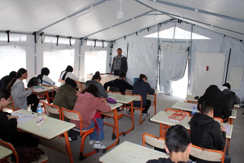 Hatay'ın Erzin ilçesinde Şehit Oğuzcan Ekiz İmam Hatip Ortaokulu bahçesinde kurulan çadır sınıflarda, Liselere Geçiş Sistemi (LGS) sınavları ile Yükseköğretim Kurumları Sınavı'na (YKS) hazırlanan öğrencilere kurs veriliyor.