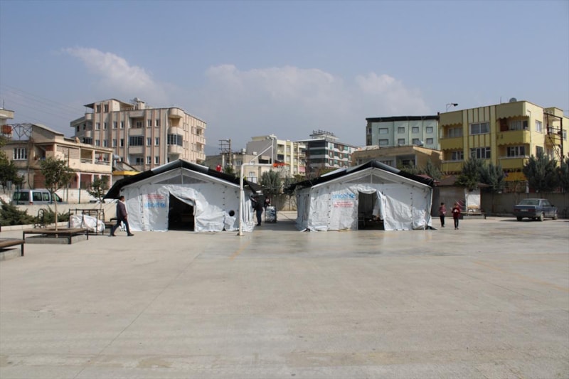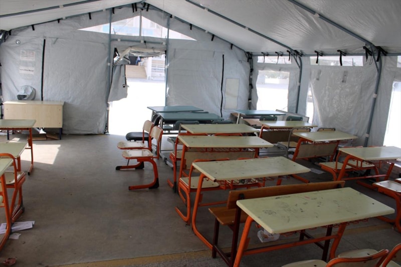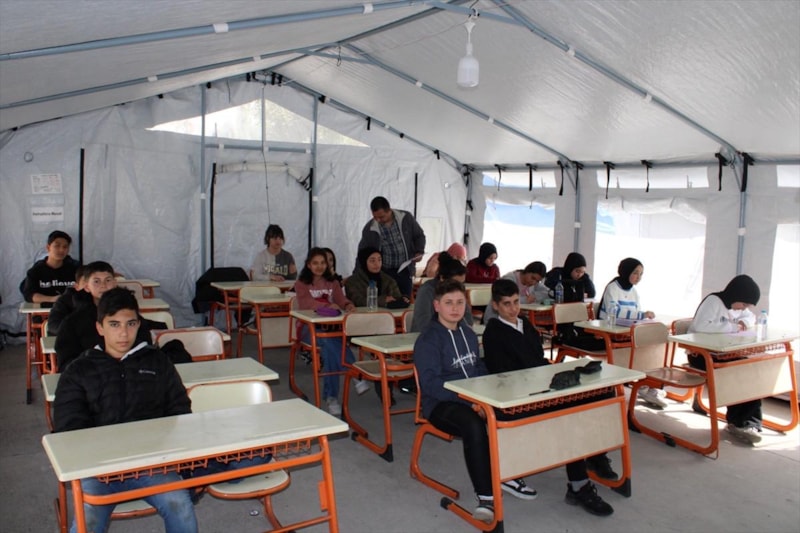11 vuran depremlerden etkilenen Hatay'da, depremzede öğrenciler için okulun bahçesinde çadır sınıflar oluşturuldu.