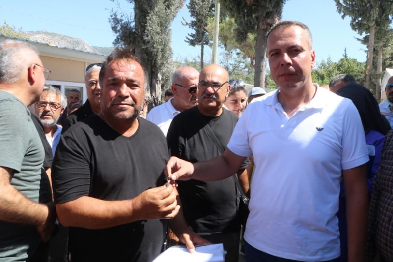 Prefabrik iş yerlerinin anahtarları, kurayla belirlenen esnafa Hatay Vali Yardımcısı Onur Özaydın tarafından teslim edildi.