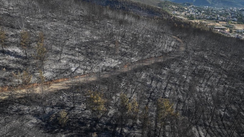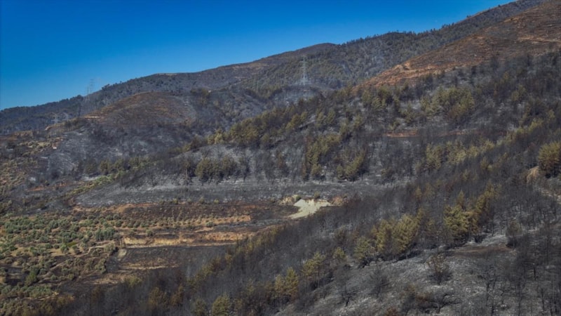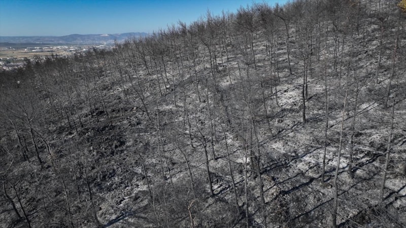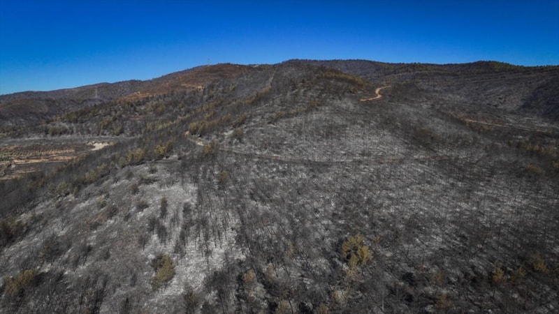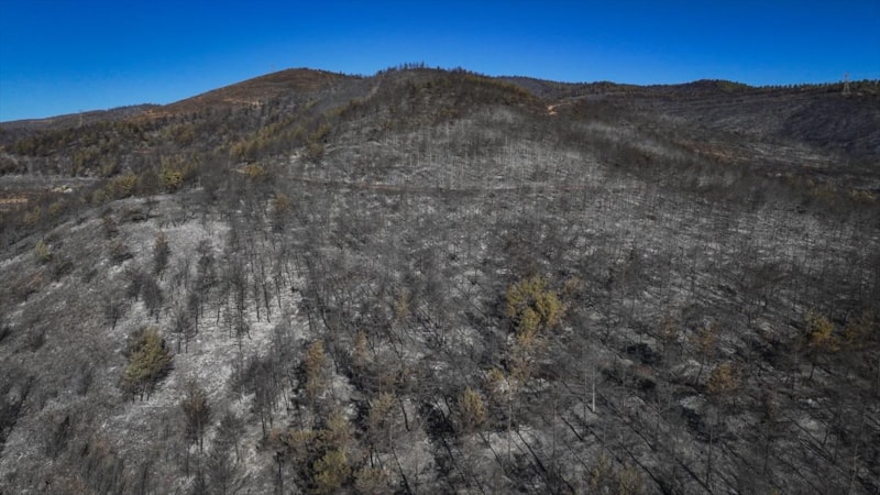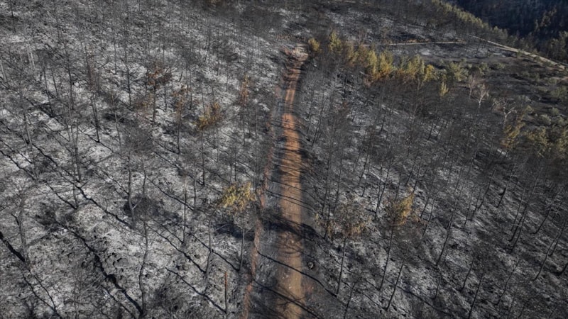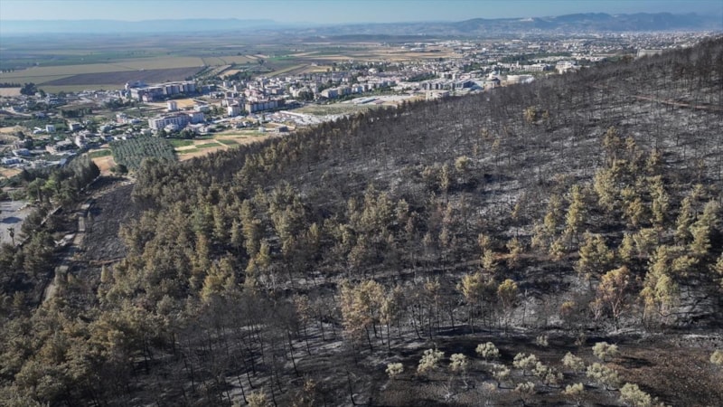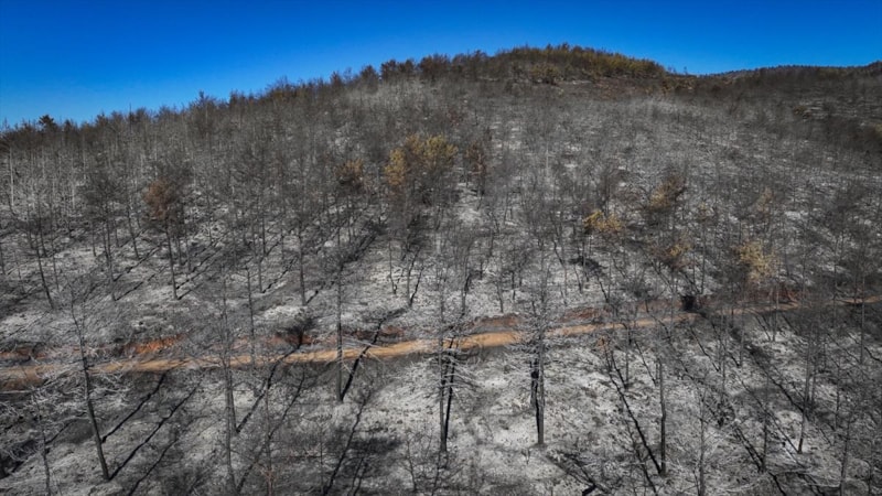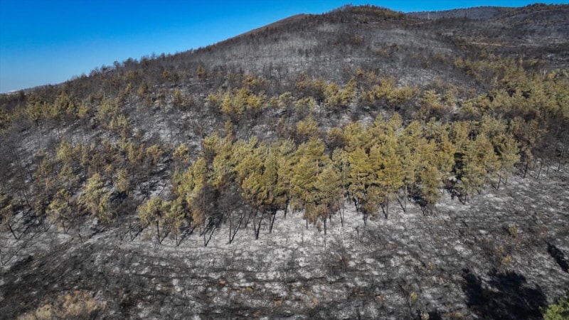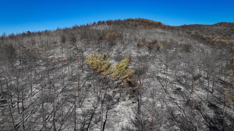 Görüntülerde, yanan alanların yerleşim yerlerine yakınlığı ve alandaki birçok ağacın küle dönmesi yer aldı.