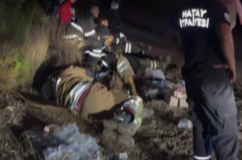 Dörtyol ilçesinde çıkan orman yangınına müdahale devam ederken söndürme çalışmalarında yer alan personellerin yorgun düşerek yere uzandığı anlar kameraya yansıdı.