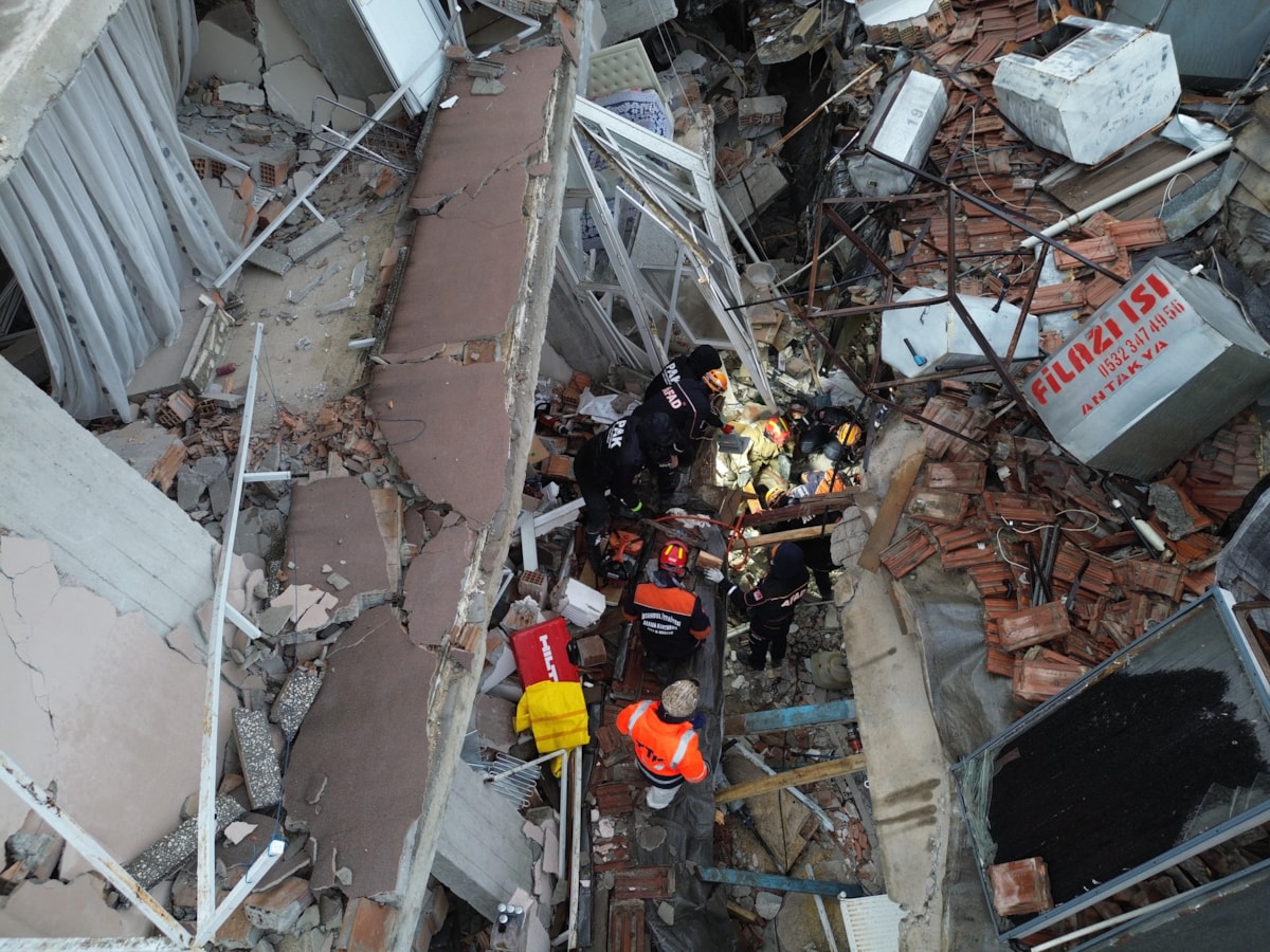 Gazi Mahallesi, Şehit Murat Nuraydın Caddesi'nde bir apartman yıkıldı. Enkaz alanı sabahın ilk saatlerinde havadan görüntülendi.