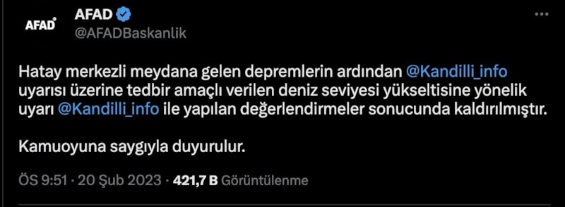 AFAD, "Hatay'daki depremlerin ardından Kandilli Rasathanesinin uyarısıyla tedbir amaçlı verilen deniz seviyesi yükseltisine yönelik uyarı, değerlendirmeler sonucunda kaldırılmıştır." çağrısında bulundu.