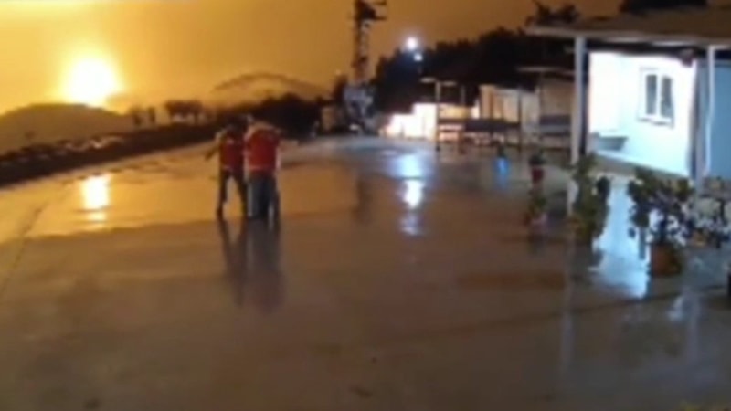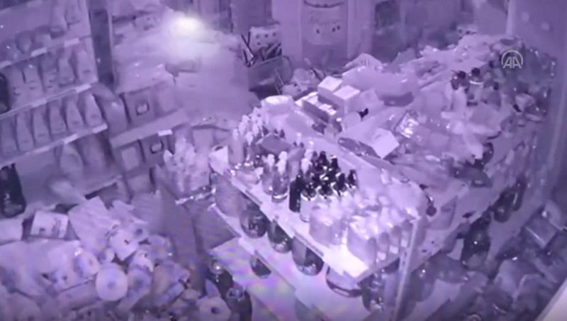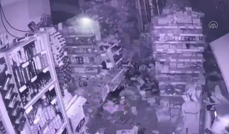 Hatay'daki bir akaryakıt istasyonu kamerası tarafından kaydedilen görüntülerde; sarsıntının ardından gökyüzü bir anda aydınlanıyor. İstasyon çalışanları deprem sırasında ayakta durmak için birbirlerine sarılıyor.