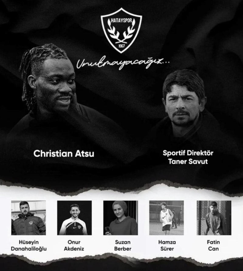 Son maçını depremden saatler önce Hatay'da oynayan bordo beyazlı ekipte Ganalı futbolcu Christian Atsu, Sportif Direktör Taner Savut, altyapı kaleci antrenörü Hüseyin Danahaliloğlu, 15 yaş altı oyuncusu Fatin Can, 14 yaş altı futbolcusu Hamza Sürer, malzeme sorumlusu Onur Akdeniz ve mutfak çalışanı Suzan Berber, depremde hayatını kaybetmişti.