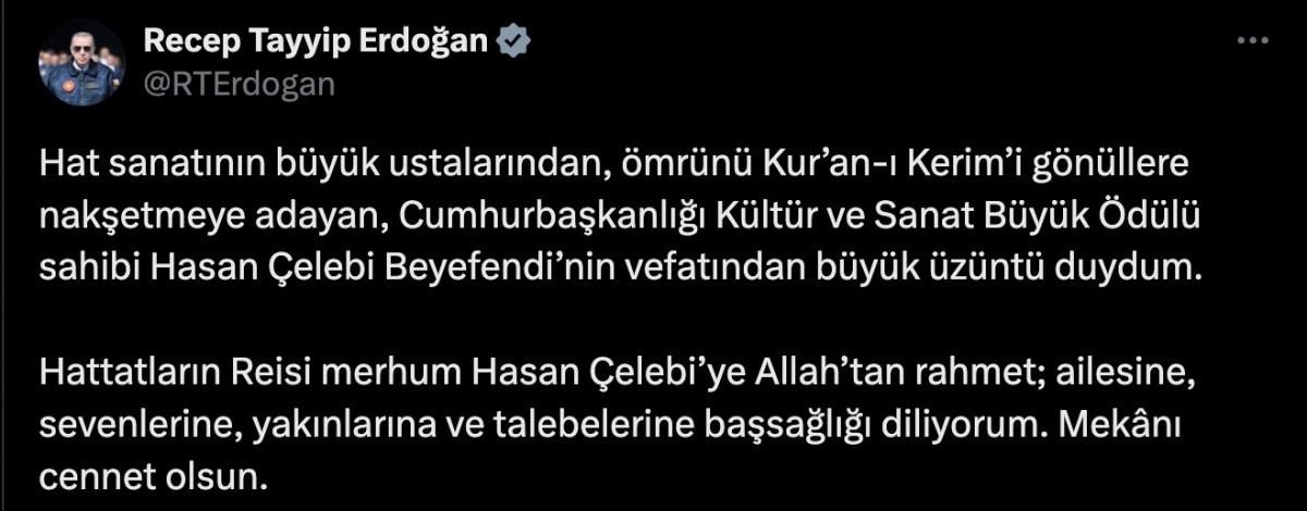 Öte yandan Cumhurbaşkanı Recep Tayyip Erdoğan sosyal medya hesabından Hattat Hasan Çelebi için taziye mesajı yayınladı.