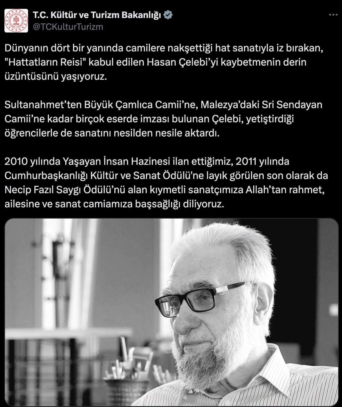 Kültür ve Turizm Bakanlığı da Hattat Hasan Çelebi için sosyal medya hesabından taziye mesajı paylaştı.