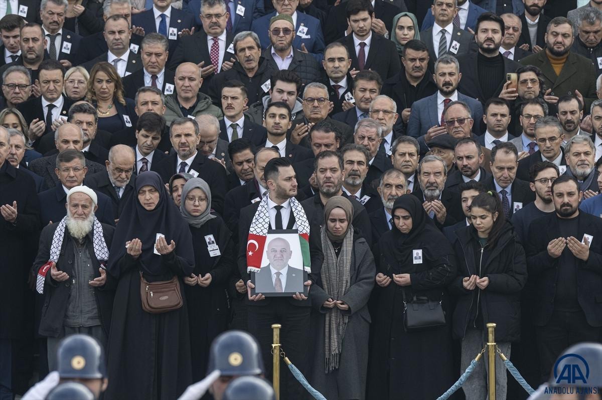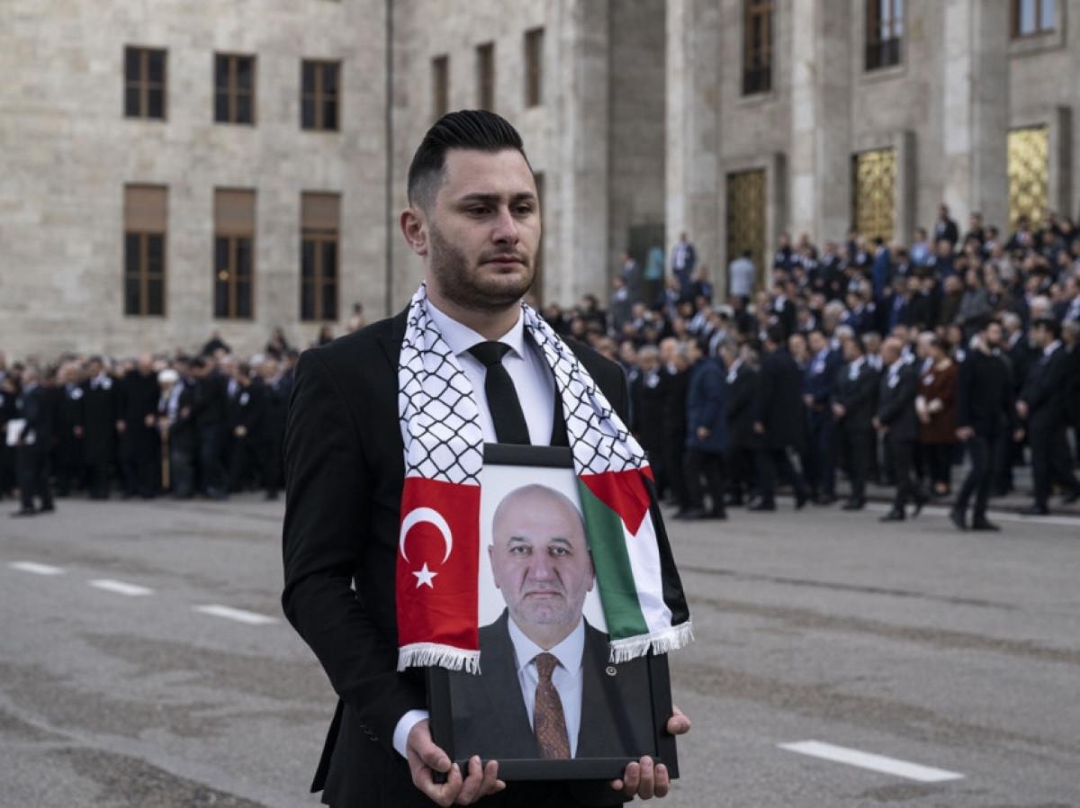 Hasan Bitmez'in Türk bayrağına sarılı tabutuna Saadet Partisi Hatay Milletvekili Necmettin Çalışkan tarafından Filistin bayrağı konuldu.