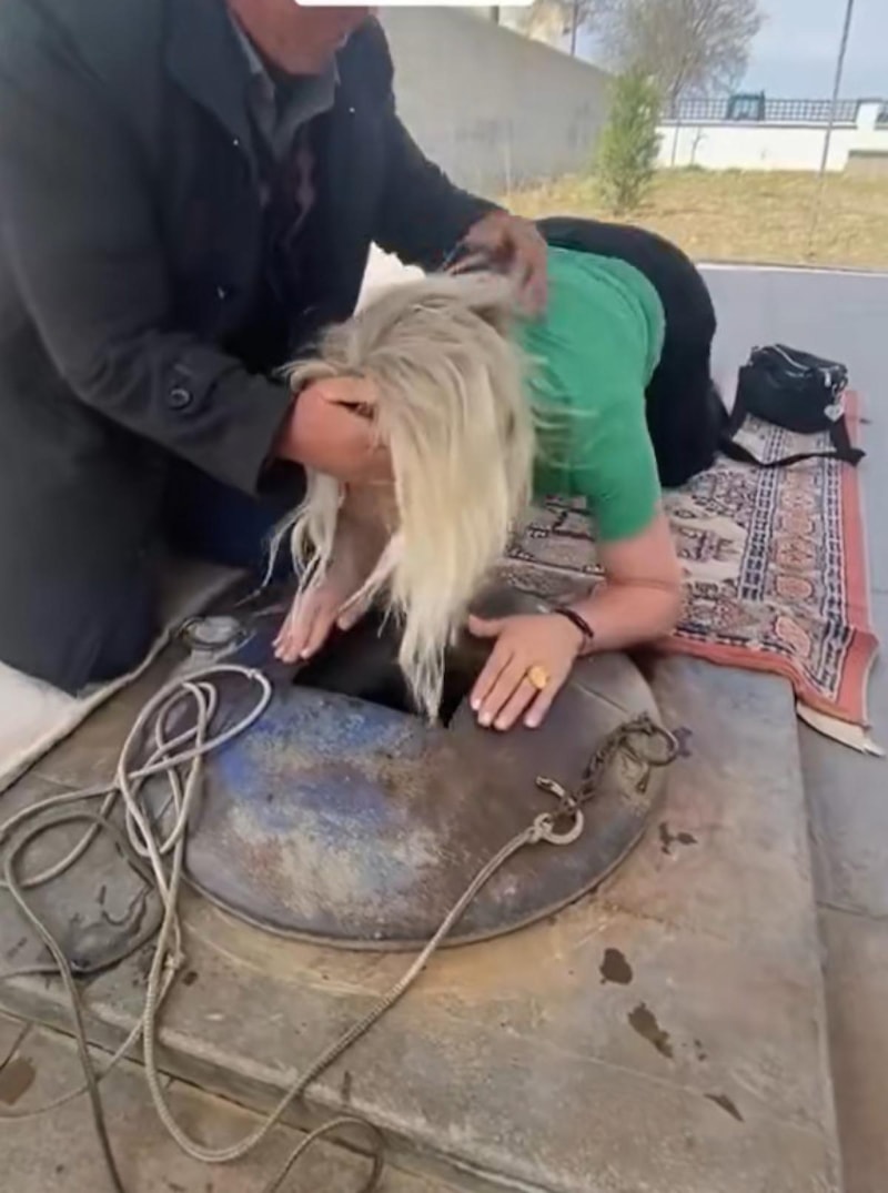 Görüntülerde delikten aşağıya yüz üstü yatarak bakarak ve metan gazı koklayan kadın, bir süre baygınlık geçirdi..