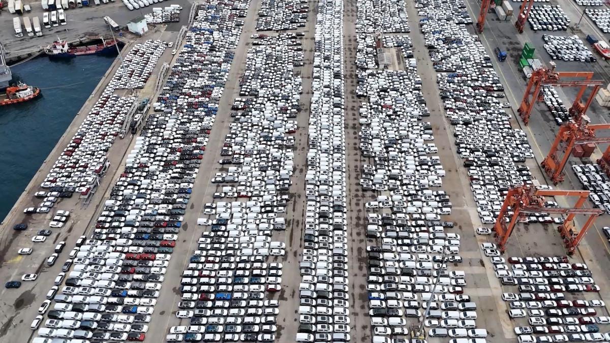 Dron ile kaydedilen görüntülerde, limanın büyük bölümünü kaplayan yüzlerce aracın oluşturduğu sıra sıra dizili manzara dikkat çekti.