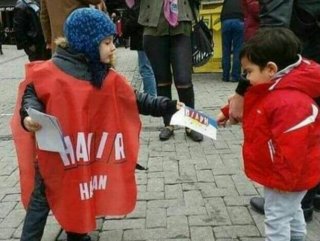 16 Nisan çalışmaları kapsamında çekilen bir fotoğrafta, arkadaşlarıyla parkta oyun oynaması gereken 5 yaşlarında küçük bir çocuğun 'hayır' bildirisi dağıttığı görülüyor.