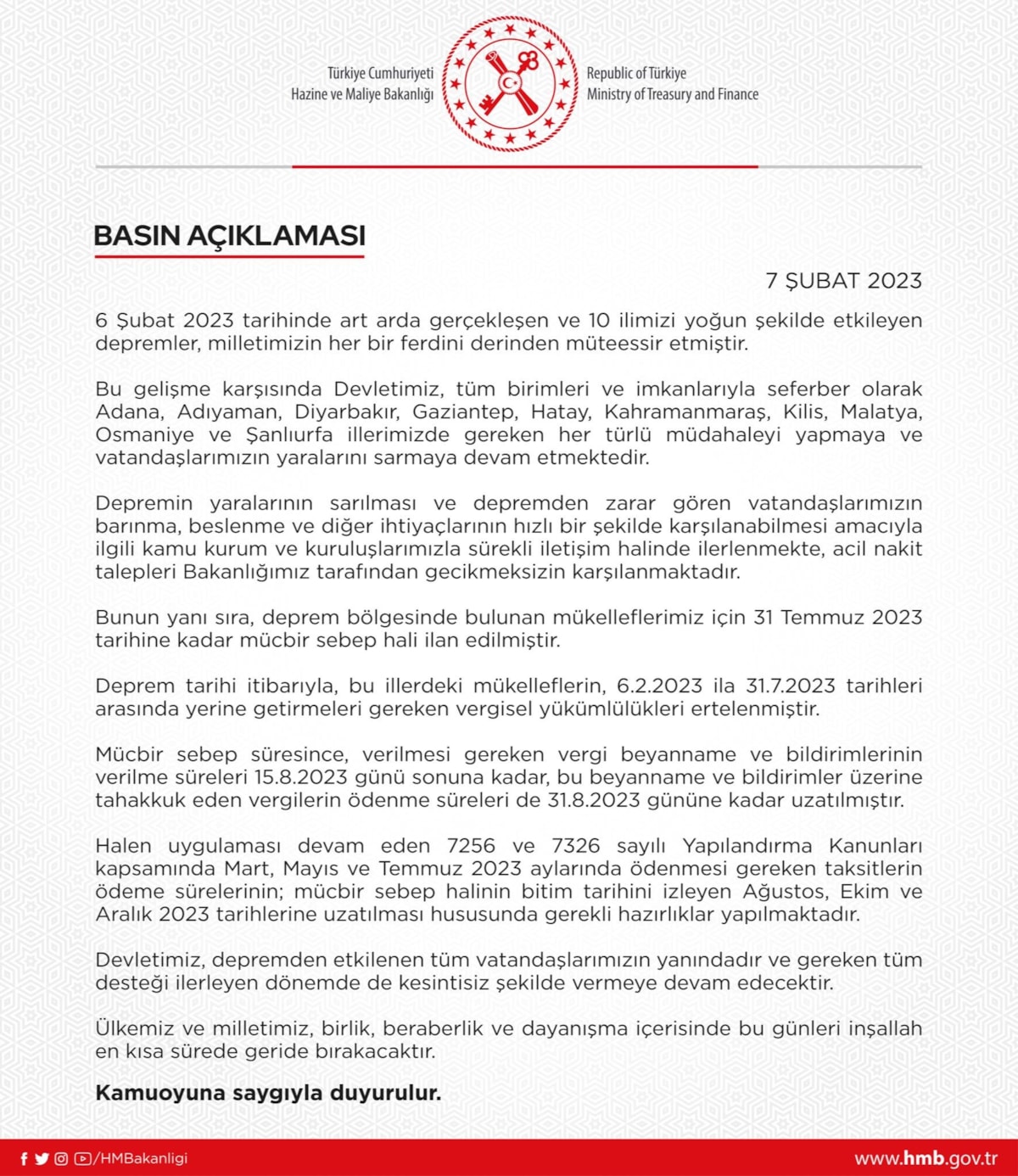 6 Şubat 2023 tarihinde art arda gerçekleşen ve 10 ilimizi yoğun şekilde etkileyen depremler, milletimizin her bir ferdini derinden müteessir etmiştir. Bu gelişme karşısında devletimiz, tüm birimleri ve imkanlarıyla seferber olarak Adana, Adıyaman, Diyarbakır, Gaziantep, Hatay, Kahramanmaraş, Kilis, Malatya, Osmaniye ve Şanlıurfa illerimizde gereken her türlü müdahaleyi yapmaya ve vatandaşlarımızın yaralarını sarmaya devam etmektedir. Depremin yaralarının sarılması ve depremden zarar gören vatandaşlarımızın barınma, beslenme ve diğer ihtiyaçlarının hızlı bir şekilde karşılanabilmesi amacıyla ilgili kamu kurum ve kuruluşlarımızla sürekli iletişim halinde ilerlenmekte, acil nakit talepleri Bakanlığımız tarafından gecikmeksizin karşılanmaktadır. Bunun yanı sıra, deprem bölgesinde bulunan mükelleflerimiz için 31 Temmuz 2023 tarihine kadar mücbir sebep hali ilan edilmiştir. Deprem tarihi itibarıyla bu illerdeki mükelleflerin 6.2.2023 ila 31.7.2023 tarihleri arasında yerine getirmeleri gereken vergisel yükümlülükleri ertelenmiştir. Mücbir sebep süresince verilmesi gereken vergi beyanname ve bildirimlerinin verilme süreleri 15.8.2023 günü sonuna kadar, bu beyanname ve bildirimler üzerine tahakkuk eden vergilerin ödenme süreleri de 31.8.2023 gününe kadar uzatılmıştır. Halen uygulaması devam eden 7256 ve 7326 sayılı Yapılandırma Kanunları kapsamında Mart, Mayıs ve Temmuz 2023 aylarında ödenmesi gereken taksitlerin ödeme sürelerinin mücbir sebep halinin bitim tarihini izleyen Ağustos, Ekim ve Aralık 2023 tarihlerine uzatılması hususunda gerekli hazırlıklar yapılmaktadır. Devletimiz, depremden etkilenen tüm vatandaşlarımızın yanındadır ve gereken tüm desteği ilerleyen dönemde de kesintisiz şekilde vermeye devam edecektir. Ülkemiz ve milletimiz, birlik, beraberlik ve dayanışma içerisinde bu günleri inşallah en kısa sürede geride bırakacaktır