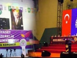 (Kongre salonunda Atatürk, Türk Bayrağı ve Öcalan posterleri biraradaydı)