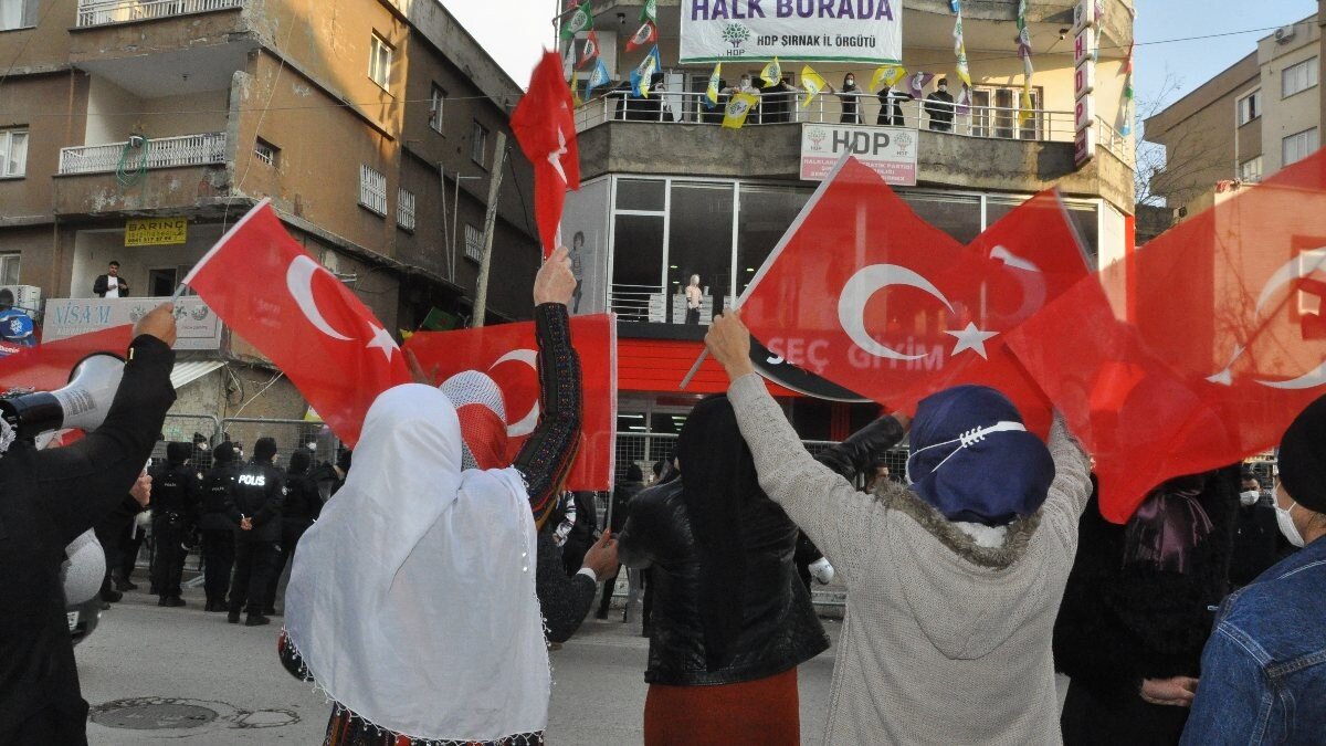Acılı ailelere şehit aileleri ve Şırnaklı kadınlar eşlik etti. Yoğun güvenlik önlemleri altında ellerinde Türk bayrakları ile HDP il binasına gelen kadınlar, terör örgütü PKK'ya ve HDP'ye tepkilerini dile getirdi.