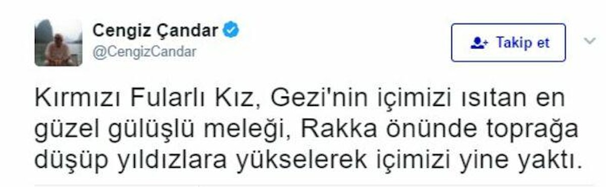 Çandar, Gezi olaylarında gündem olan ve daha sonra PKK'ya katılan bir terörist için de attığı tweet'inde "Kırmızı Fularlı Kız, Gezi'nin içimizi ısıtan en güzel gülüşlü meleği, Rakka önünde toprağa düşüp yıldızlara yükselerek içimizi yine yaktı." ifadelerine yer vermişti.