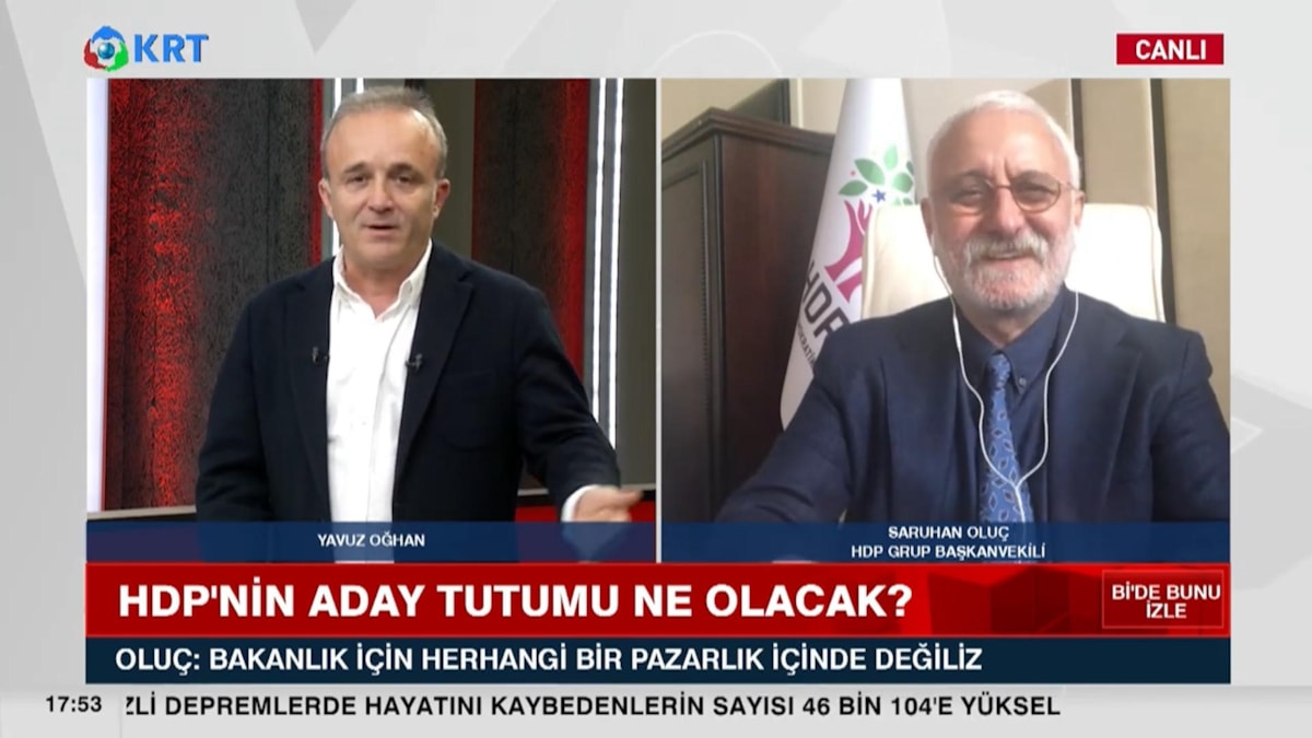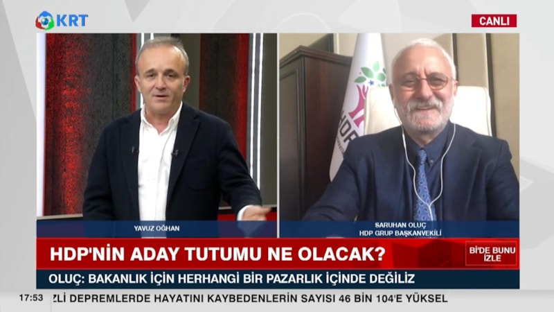 KRT TV'de Yavuz Oğhan'ın konuğu olan HDP Grup Başkanvekili Saruhan Oluç, bakanlık için Millet İttifakı'yla herhangi bir pazarlık içinde olmadıklarını söyledi.