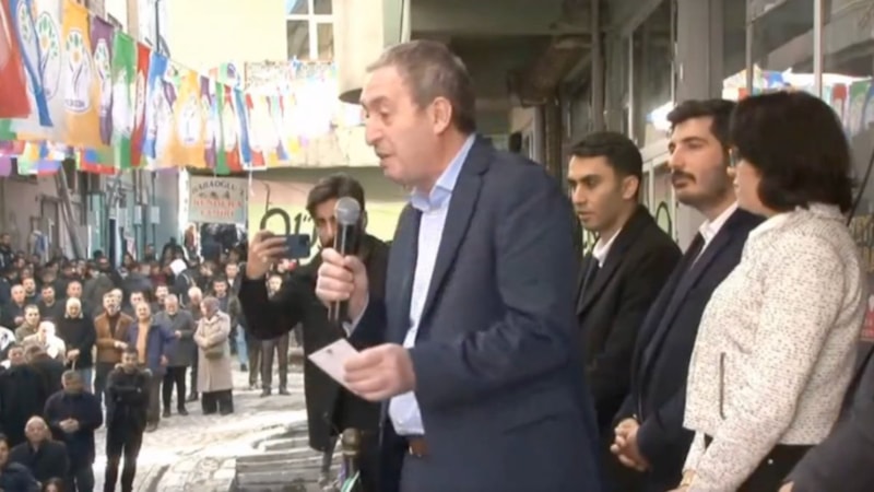 Hakkari'de cuma vakti miting yapan HEDEP Eş Genel Başkanı Tuncer Bakırhan, ezanı duyunca cumaya hareketlenen halktan dağılmamasını isterken, cumayı hep beraber kaza edeceklerini söyledi.