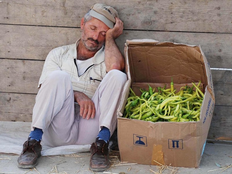 Bolu'nun Mudurnu ilçesinde tarlasında yetiştirdiği ürünleri satmak için pazara getiren bir vatandaş, sıcağa yenilerek uyuyakaldı. (Arşiv- 28 Temmuz 2007)