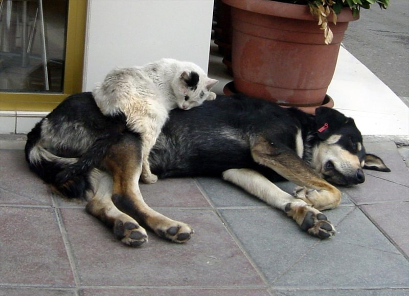 İzmir'in Güzelyalı semti Mithatpaşa Caddesi üzerinde uyuyan bir kedi ile köpek. (Arşiv-18 Mayıs 2008)