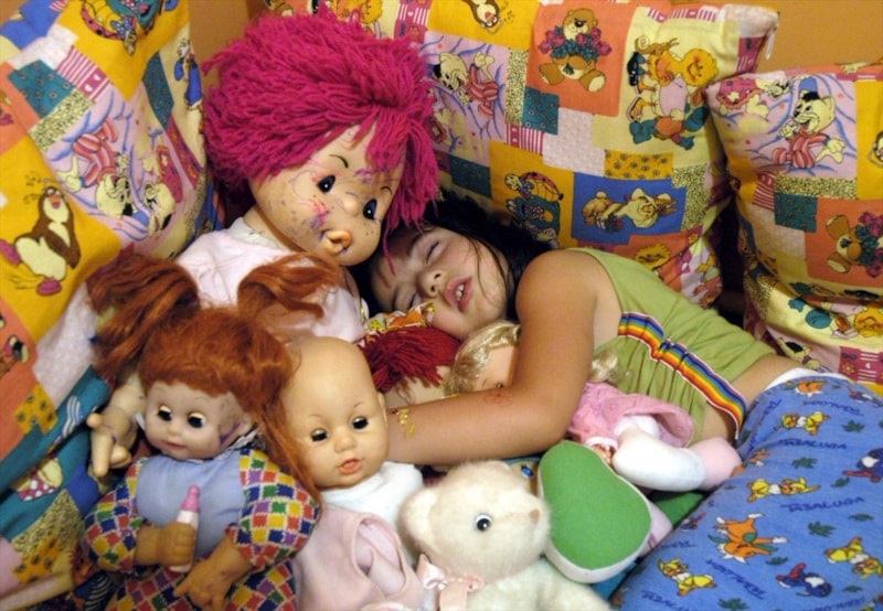 Ankara'da oyuncak bebeklerine sarılarak uyuyan bir kız çocuğu. (Arşiv-14 Eylül 2006)