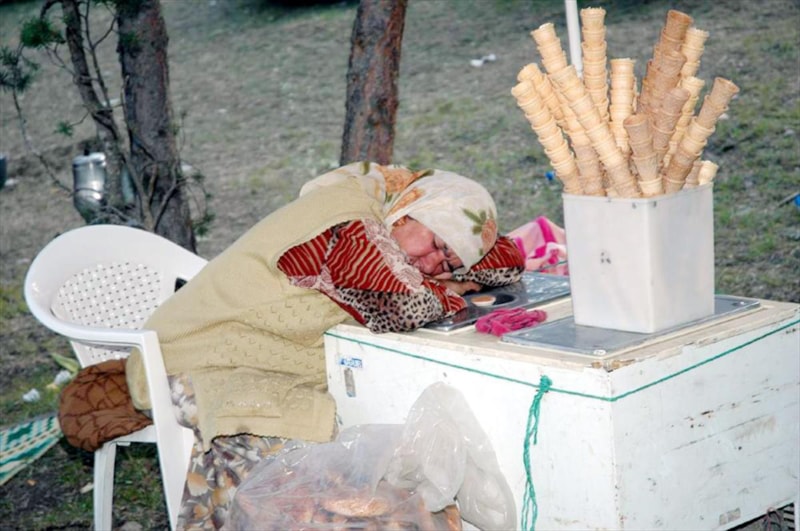 Sivas'ın Koyulhisar ilçesinde yorgunluğa dayanamayan bir dondurma satıcısı tezgahı başında uyuyakaldı. (Arşiv-13 Ağustos 2006)