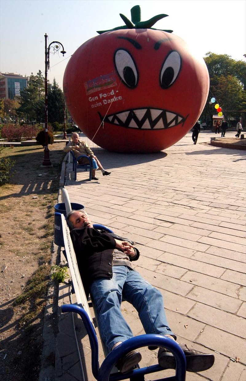 Genetiği Değiştirilmiş Organizmalara (GDO) Hayır Platformunca sergilenen "Canavar Domates Balonu" Ankara'da Abdi İpekçi Parkı'nda vatadanşların ziyaretine sunuldu. Bir vatandaşın parktaki bankta uyuduğu görüldü. (Arşiv-1 Kasım 2004)