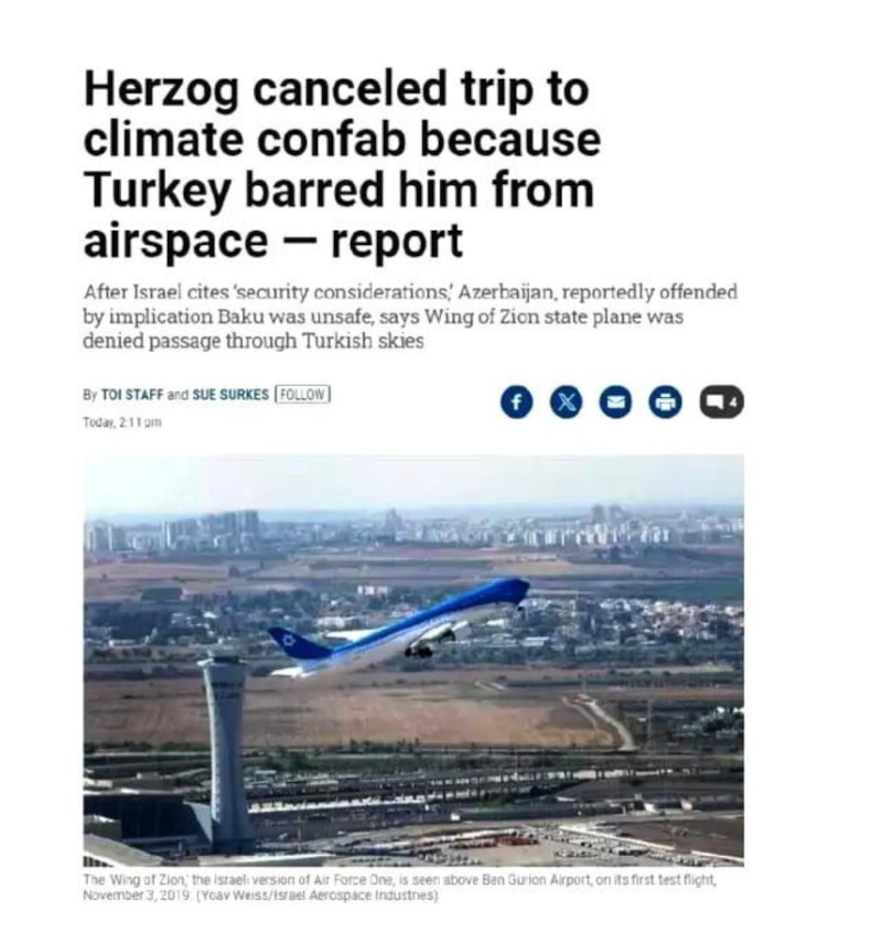 İsrail Cumhurbaşkanı Isaac Herzog, günler önce planlanan Azerbaycan ziyaretini iptal etmişti. Dış basına yansıyan haberlere göre, Herzog'un Azerbaycan ziyaretini iptal etmesinin nedeninin uçağının Türkiye hava sahasından geçmesine izin vermemesinin olduğu açıklandı.