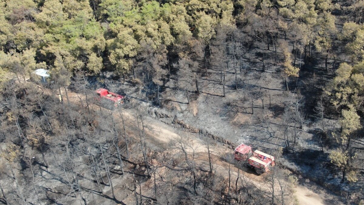 Soğutma çalışmalarının devam ettiği yangının ormanlık alanda bıraktığı hasar drone ile havadan görüntülendi.