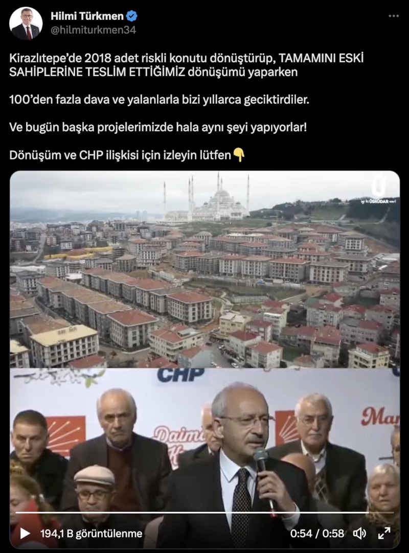 Türkme paylaşımını, "Kirazlıtepe’de 2018 adet riskli konutu dönüştürüp, tamamını eski sahiplerine teslim ettiğimiz dönüşümü yaparken 100’den fazla dava ve yalanlarla bizi yıllarca geciktirdiler. Ve bugün başka projelerimizde hala aynı şeyi yapıyorlar! Dönüşüm ve CHP ilişkisi için izleyin lütfen." notuyla yaptı.