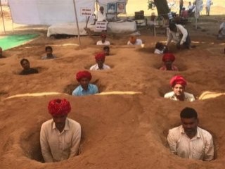 Rajasthan eyaletine bağlı Nindar Köyü'nde çiftçiler, hükümetin topraklarını alma planını kendilerini toprağa gömerek protesto etti.