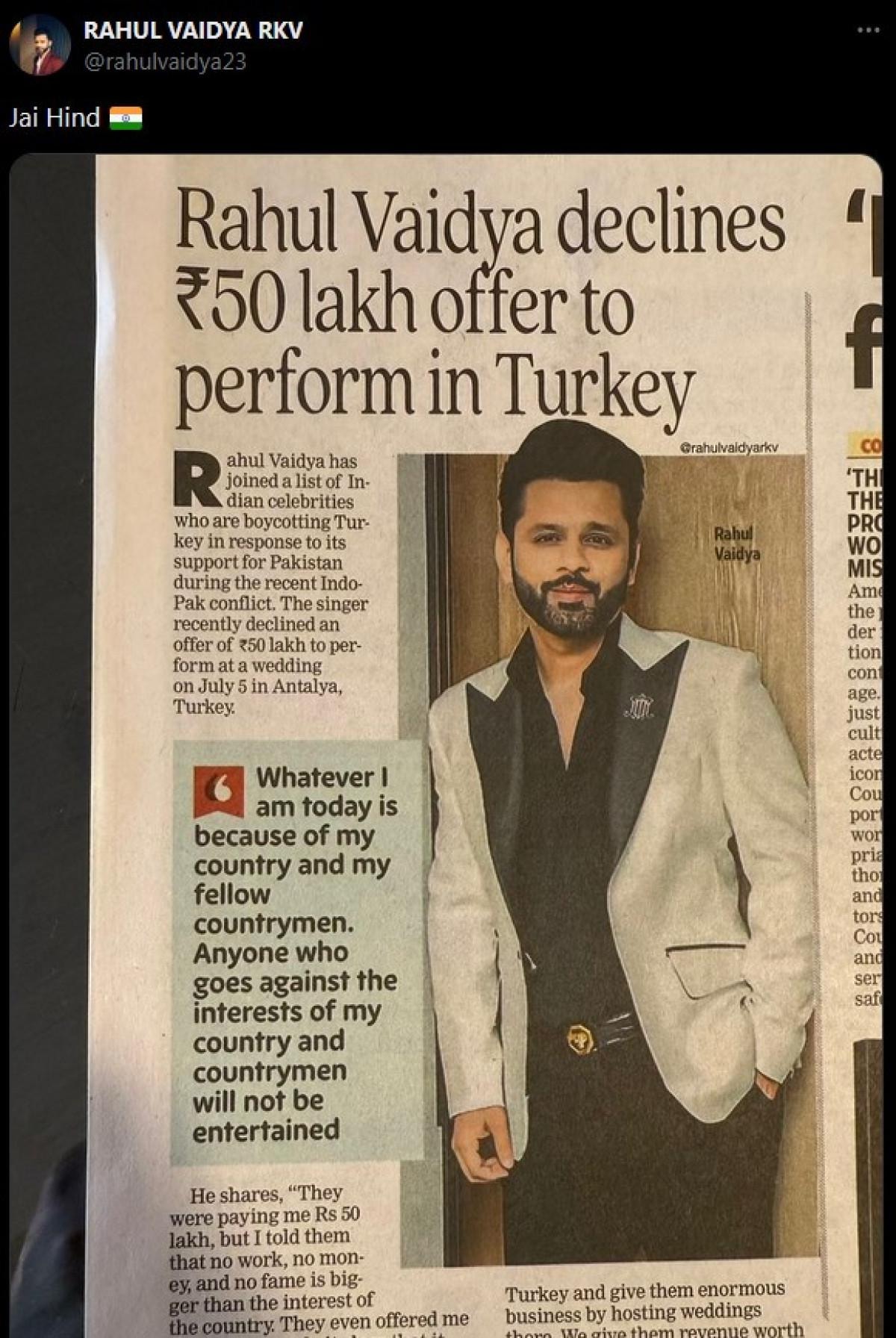 Hindistanlı şarkıcı Rahul Vaidya, Antalya’da bir düğünde sahne alması için kendisine teklif edilen yaklaşık 2,3 milyon TL’lik bir teklifi reddettiğini açıkladı. Vaidya, Türkiye’nin Hindistan Pakistan çatışmasında Pakistan’a açık desteğini eleştirerek, "Ülkeme karşı olanları eğlendirmeyeceğim" ifadelerini kullandı.