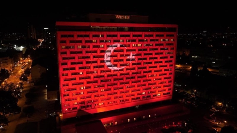 Hırvatistan'ın başkenti Zagreb'deki en yüksek binalardan biri, Türkiye Cumhuriyeti'nin kuruluşunun 100. yılı dolayısıyla Türk bayrağı renkleriyle ışıklandırıldı.
