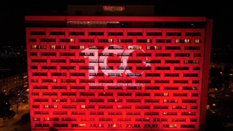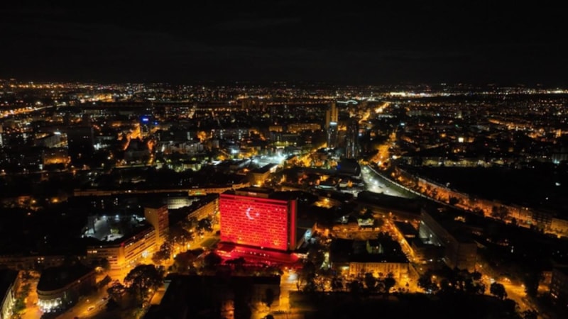 Türkiye'nin Zagreb Büyükelçiliği, "Cumhuriyet'in 100. yılı" kutlamaları münasebetiyle başkentteki en yüksek binalardan birini kırmızı-beyaz renklere büründürdü.