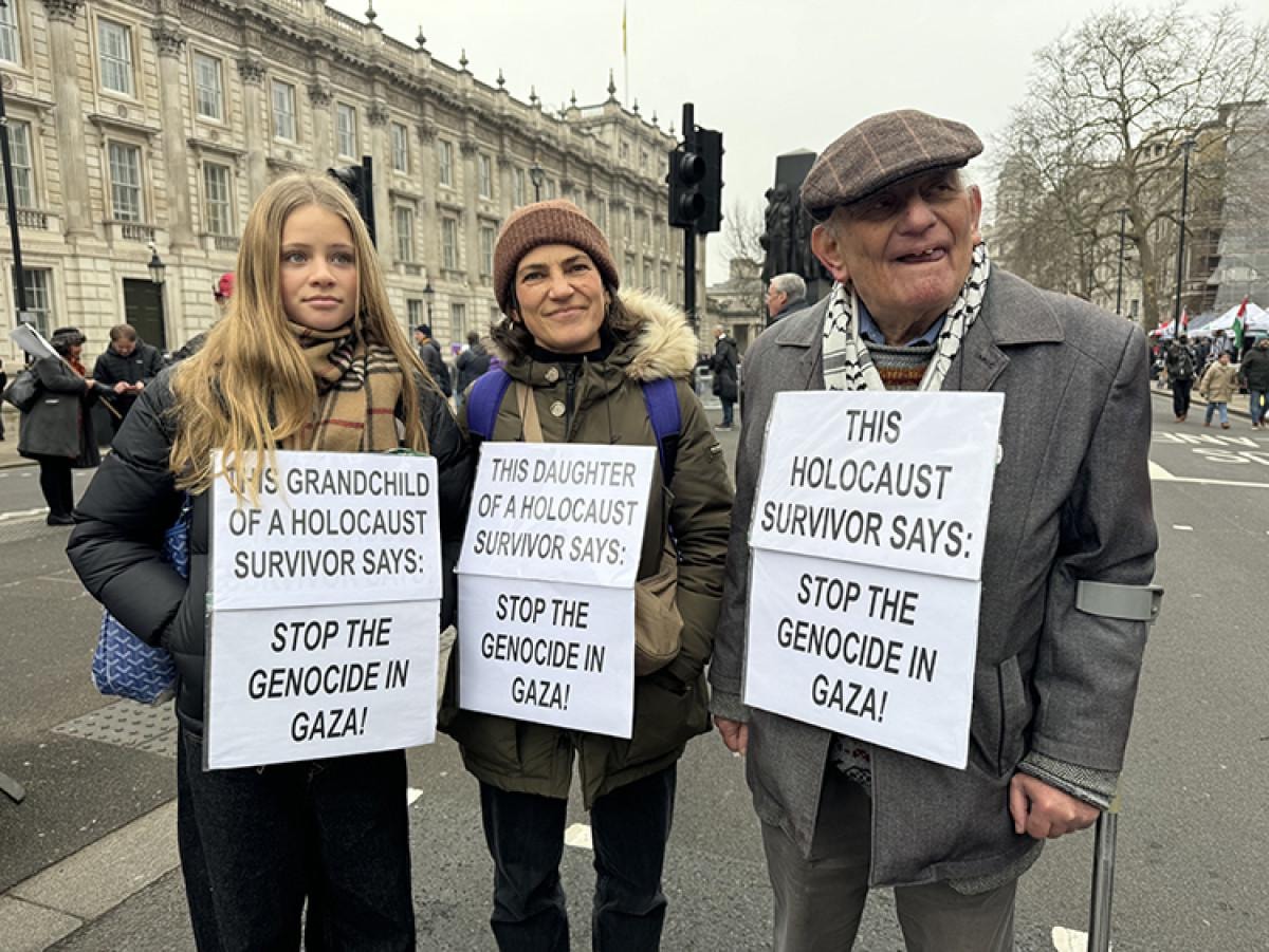 İngiltere’nin başkenti Londra’da 7 Ekim’den bu yana düzenlenen Filistin’e destek yürüyüşlerine katılan Stephen Kapos, kızı Adrea ve torunu Isla Kapos, üzerlerinde “Gazze’de soykırımı durdurun” yazılı pankartlarla İsrail’in Gazze’ye yönelik saldırılarına karşı seslerini yükseltiyor.
