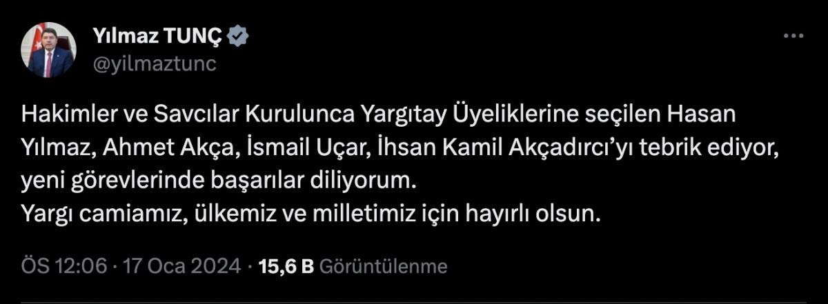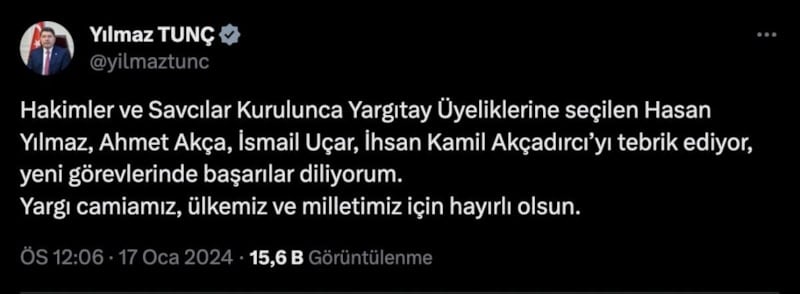"Hakimler ve Savcılar Kurulunca Yargıtay Üyeliklerine seçilen Hasan Yılmaz, Ahmet Akça, İsmail Uçar, İhsan Kamil Akçadırcı’yı tebrik ediyor, yeni görevlerinde başarılar diliyorum. Yargı camiamız, ülkemiz ve milletimiz için hayırlı olsun."