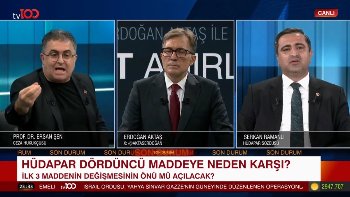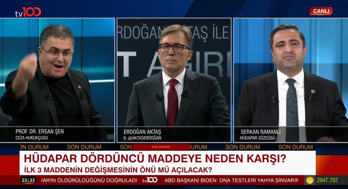 tv100'ün Erdoğan Aktaş ile Eşit Ağırlık programında bu akşam Bolu Belediye Başkanı Tanju Özcan, HÜDA-PAR Genel Başkan Yardımcısı Serkan Ramanlı ve hukukçu Ersan Şen'in konuşmaları gündem oldu.